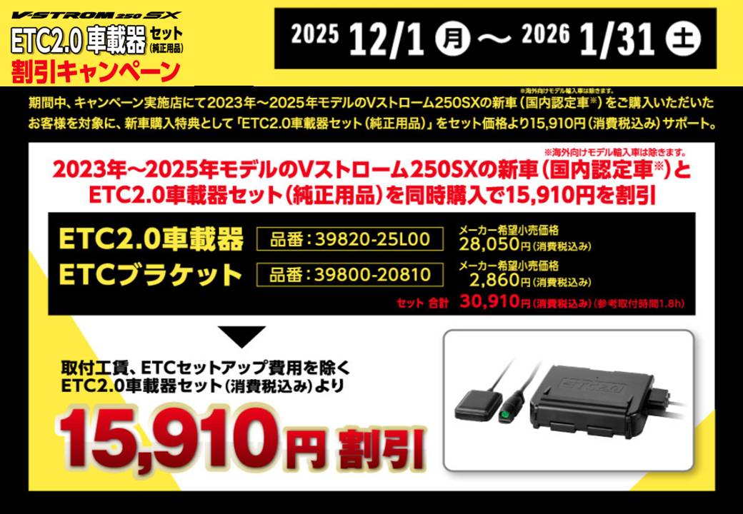 期間中、キャンペーン実施店にて2023年~2025年モデルのVストローム250SXの新車(国内認定車※)をご購入いただいたお客様を対象に、新車購入特典として「ETC2.0車載器セット(純正用品)」をセット価格より15,910円(消費税込み)サポート。