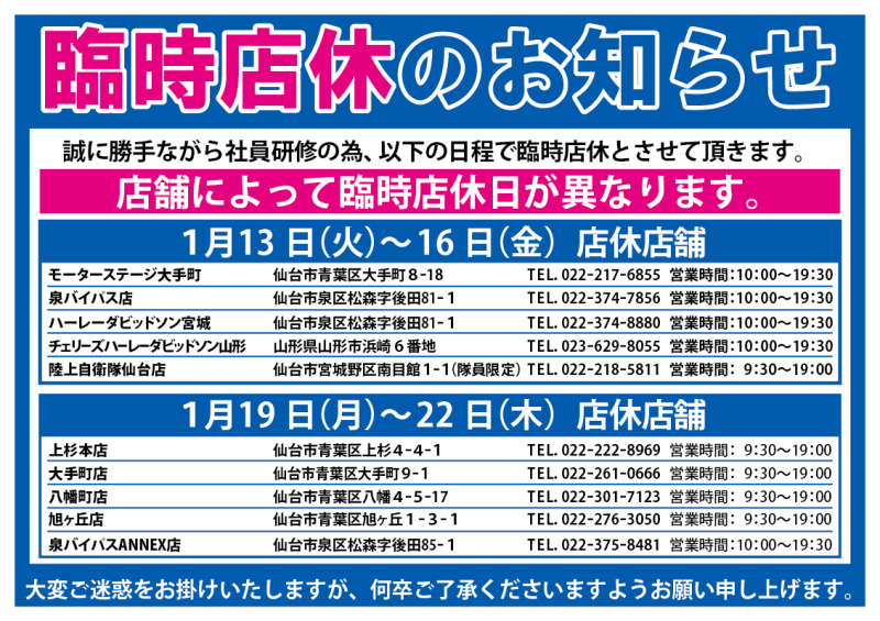 社員研修のため、下記の通りお休みを頂戴いたします。