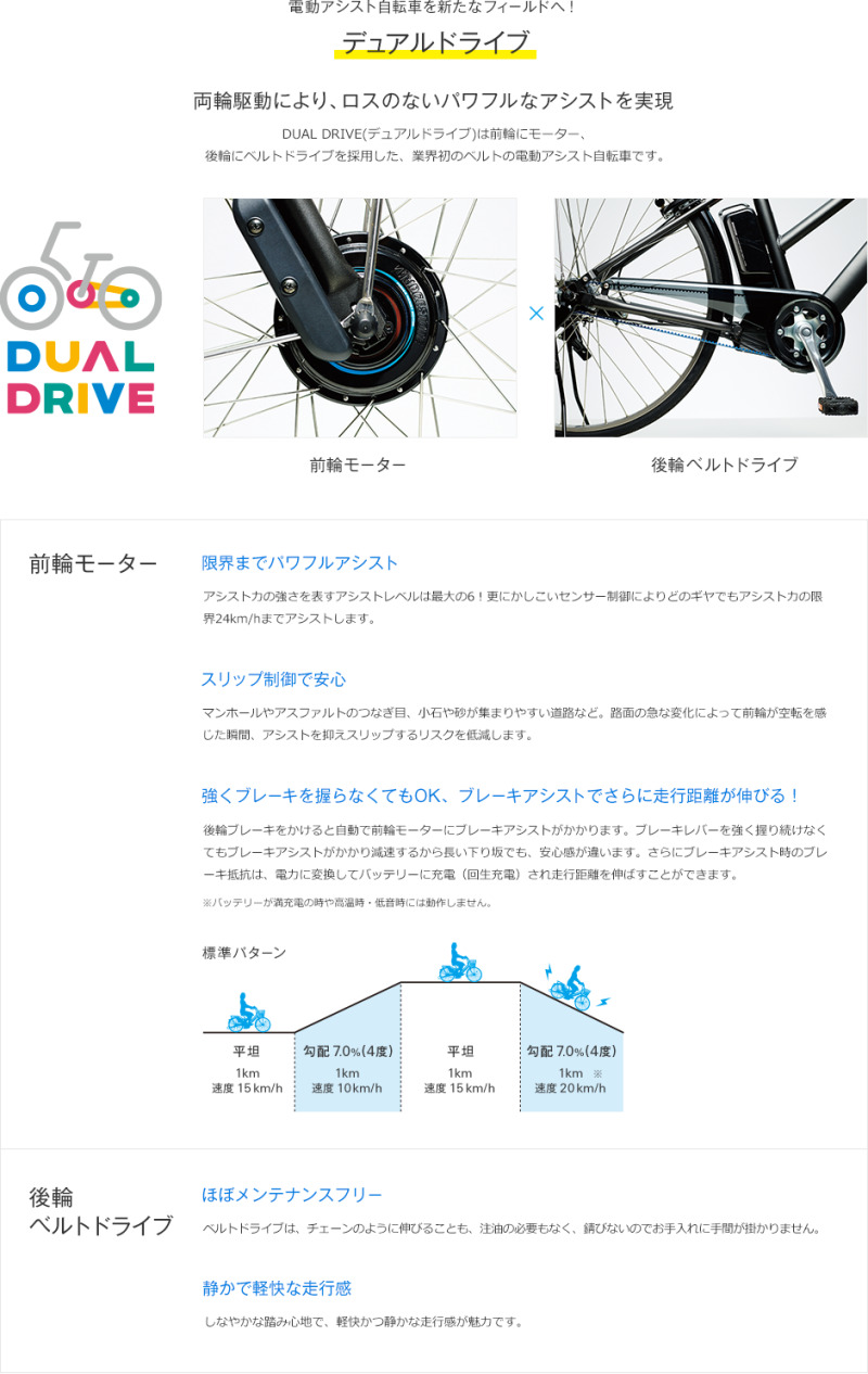 DUAL DRIVEとは、前輪にモーター、後輪にベルトドライブを採用した、