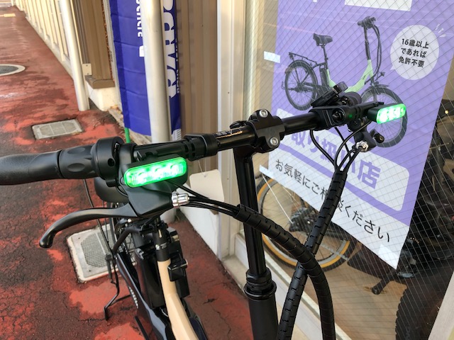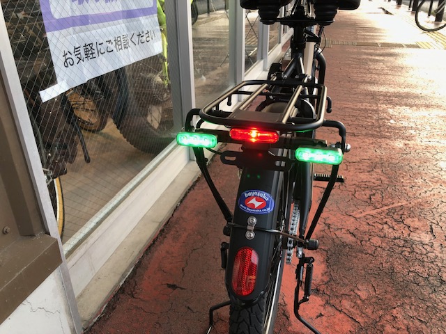 走行時は前後の緑の最高速度表示灯が点き、車道走行モードでは常時点灯、歩道走行モードでは点滅での点灯となります(‘ω’)