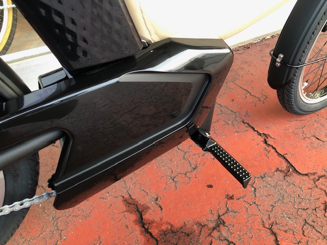 乗り方は簡単で、電動アシスト自転車と同じく、左手側の操作パネルの電源スイッチをオンにして、ステップに足を乗せ、右手側のスロットルグリップを回すと前に進みます!
