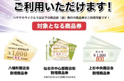 ハヤサカサイクル仙台中央店では、今月の初めより発行されている3割増商品券をご利用頂けます!! 一般軽快車・電動自転車・スポーツ自転車・自転車用品・サイクルウェア等、諸々の商品にご利用頂けます!! もちろん修理代やカスタム … 続きを読む 3割増商品券ご利用頂けます!!