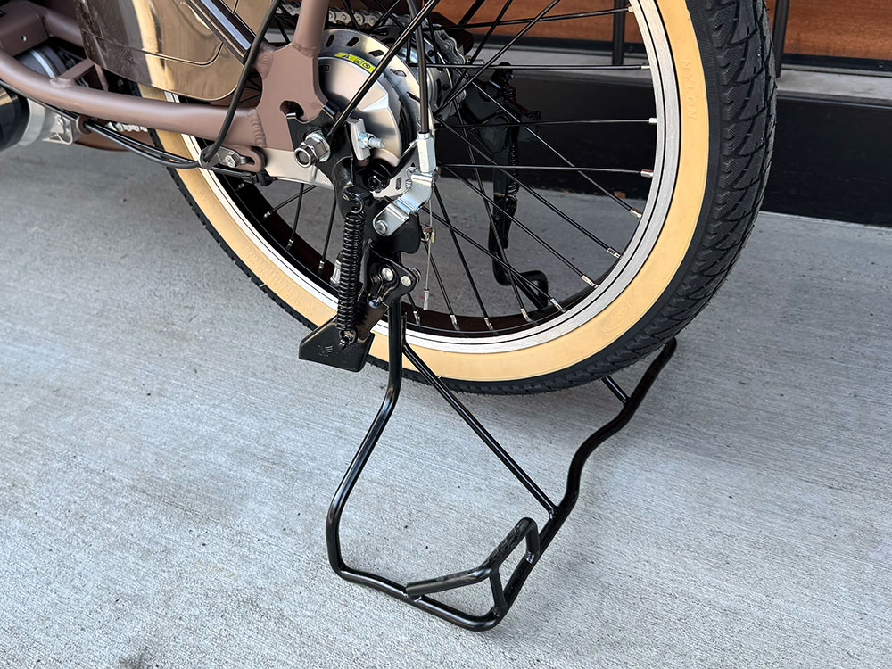 サイドに鋲がついたレトロなデザインのワイドテリーサドルです。サドル下部には、スタンドを立てるときに掴みやすい補助ガードが付いています。