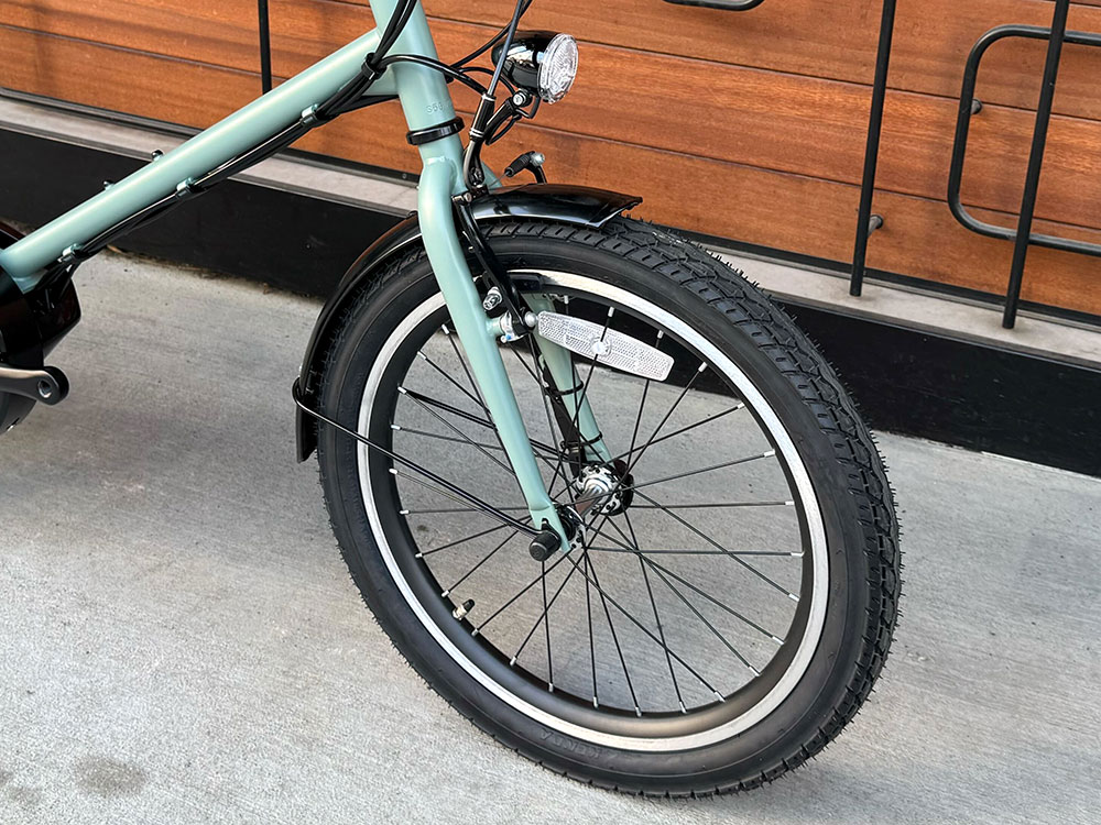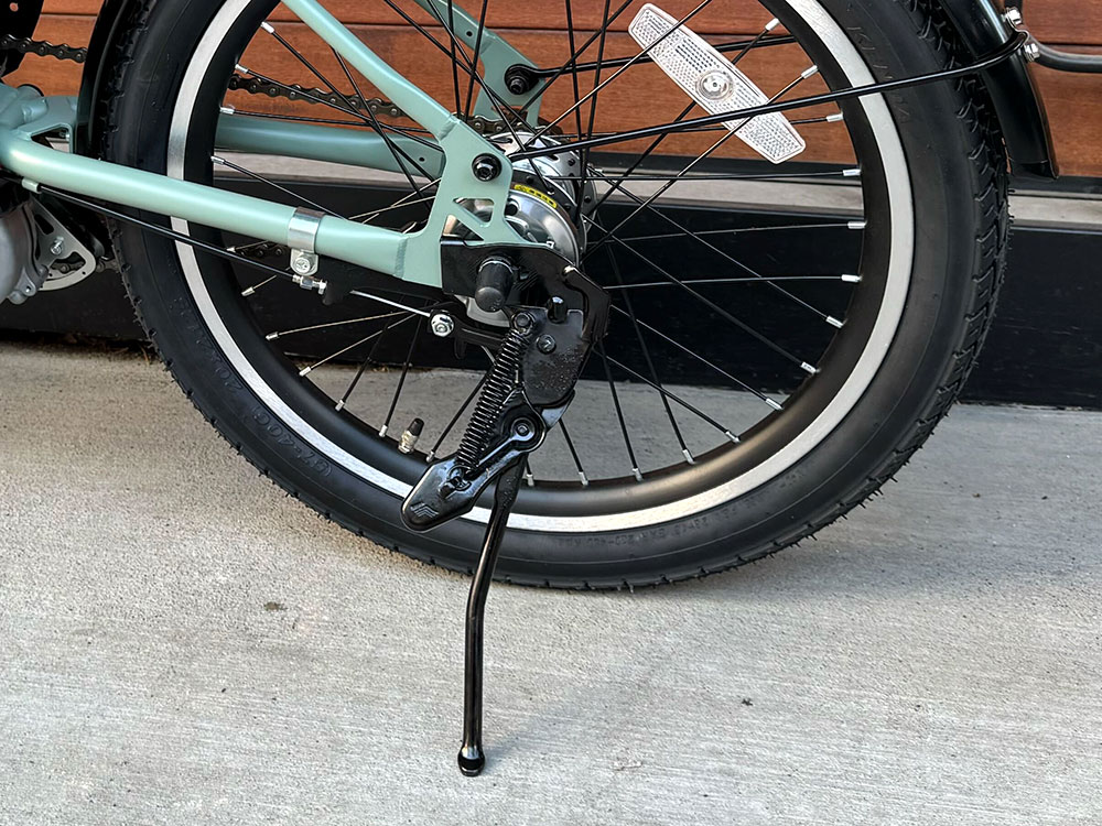 よりスタイリッシュに見える細いタイヤにもメリットはあるのですが、段差などで角度に気を付けないとハンドルを取られやすいといったデメリットもあります。PAS CRAIG ALLEYは、日常づかいしやすく、自然体で快適に乗れることにこだわっているので、街中の段差もスムーズに乗り越えられ、ちょっとした遠出も快適なファットタイヤを採用しています。前後フェンダーや片足スタンドも標準装備です。