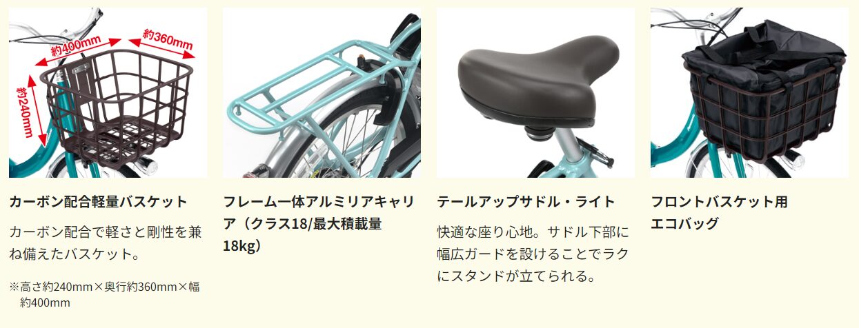 パナソニックの買い物系電動は総じてバスケットの容量は大きいのですが、ビビSLもまたフロントバスケットの容量は大きいものが装備されています。 また、フレーム一体型のリアキャリアがありますので、さらなる積載性をもたせるために後ろバスケットをつけられるのも嬉しい工夫。 前カゴ用の「カゴカバー兼エコバッグ」は、雨から荷物を守るだけではなく、ご自宅に到着したらエコバッグごと持ち帰れる便利仕様! 使いこなすと心強いアイテムになると思います。