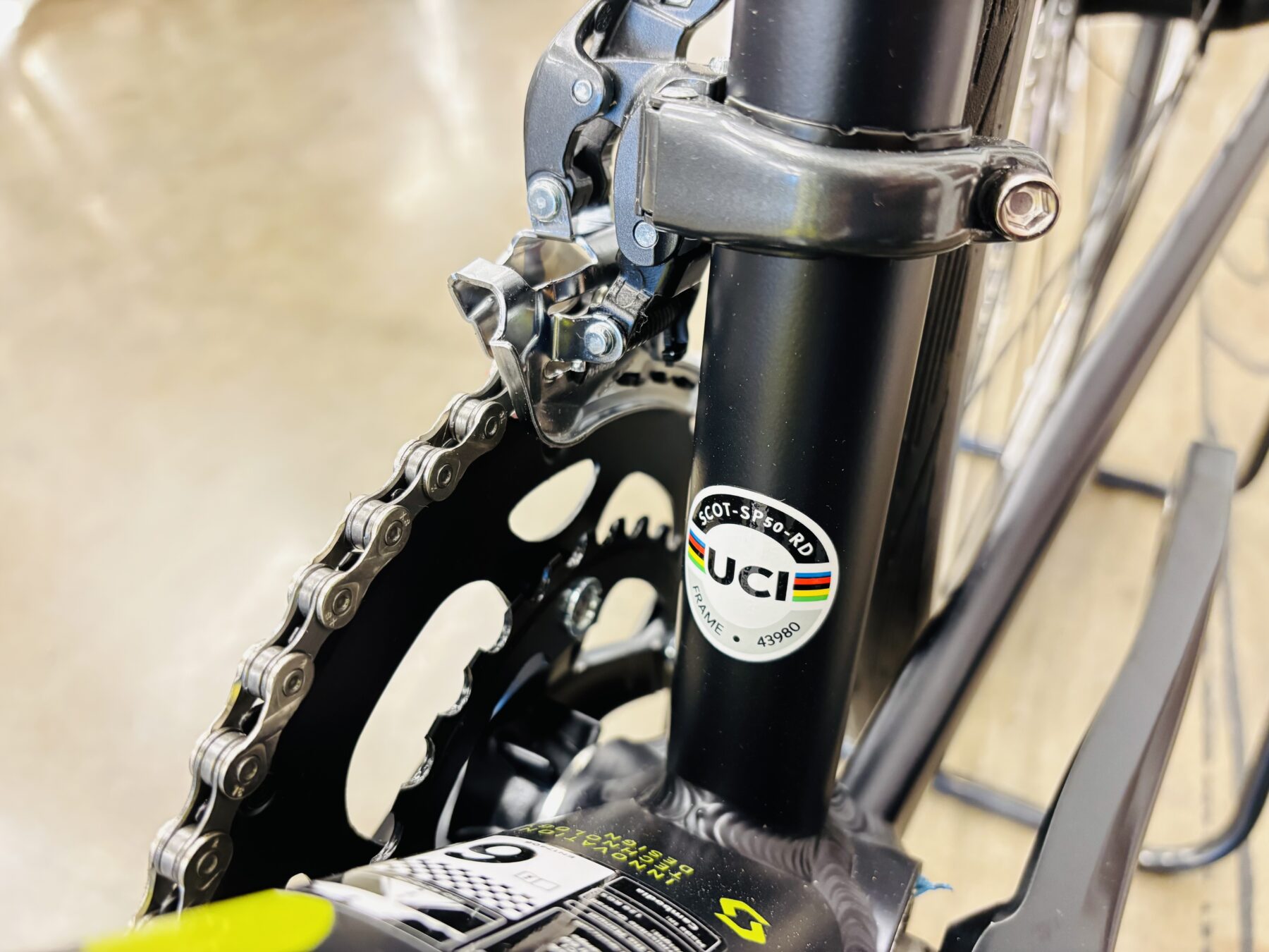 • UCI(国際自転車競技連合)認証ステッカー付き。これはフレームがUCIの定める技術規則に適合していることを示すマークです。UCI認証ステッカーは、プロの自転車競技を目指す選手や、UCI公認のレースに参加するサイクリストにとっては一つの基準となっています。