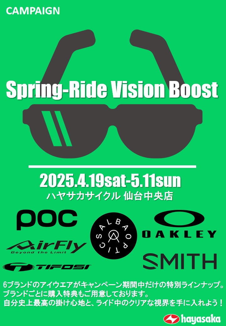 ハヤサカサイクル仙台中央店では、スポーツサイクルデビューから今シーズンのモチベーションアップまで、様々なライダーのみなさまに自分史上最高の掛け心地とクリアな視界を手に入れていただくために、アイウエアキャンペーンを実施いたします。