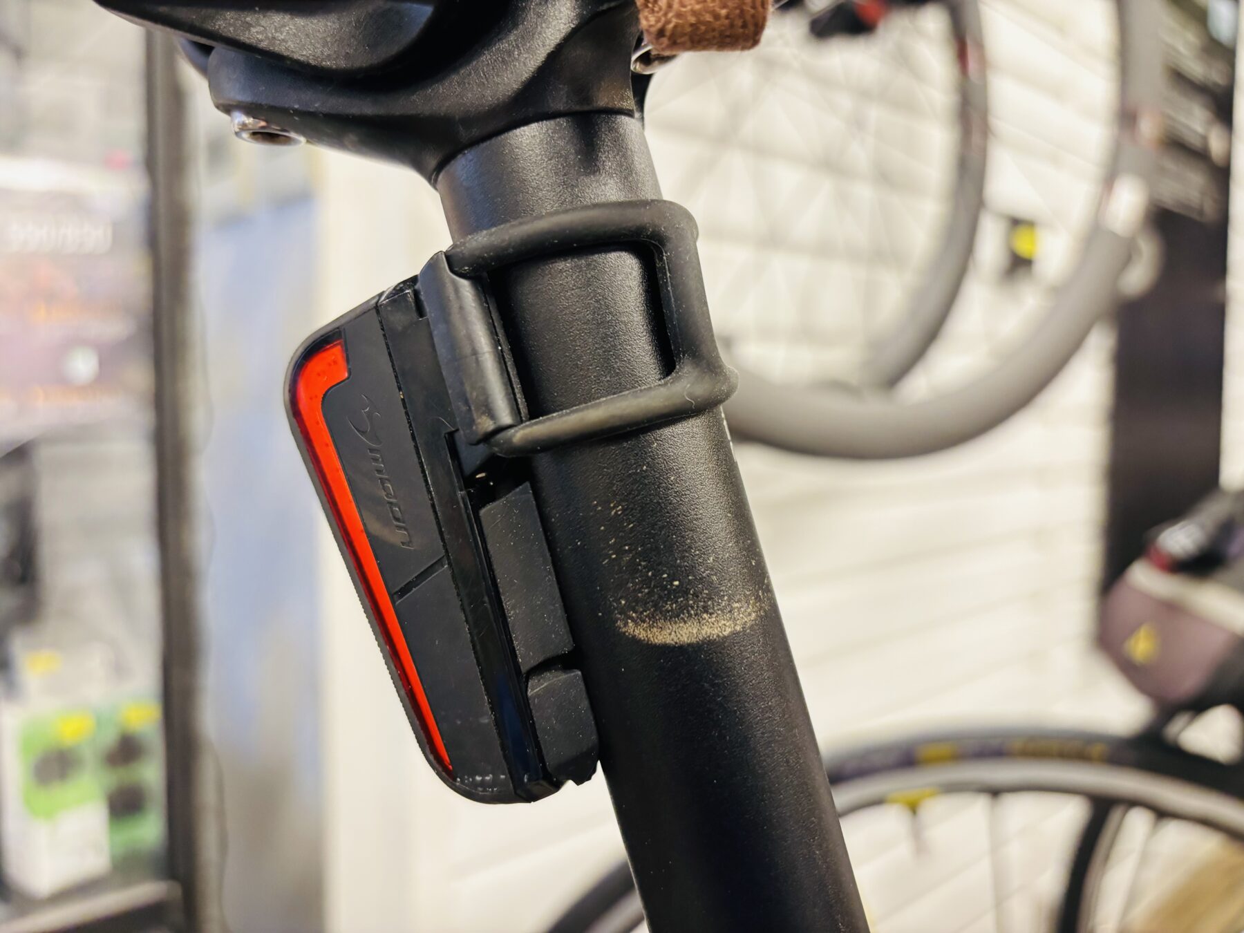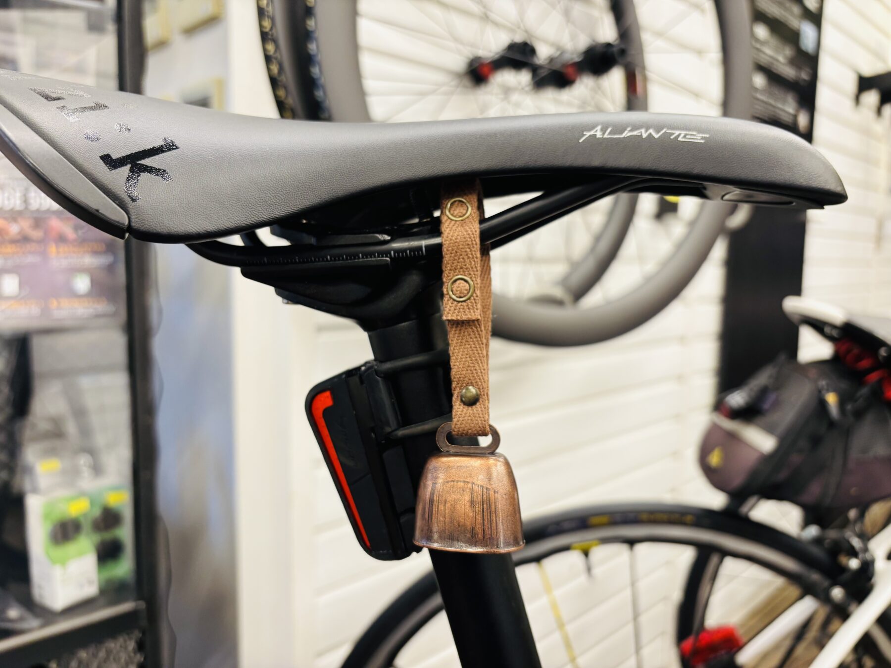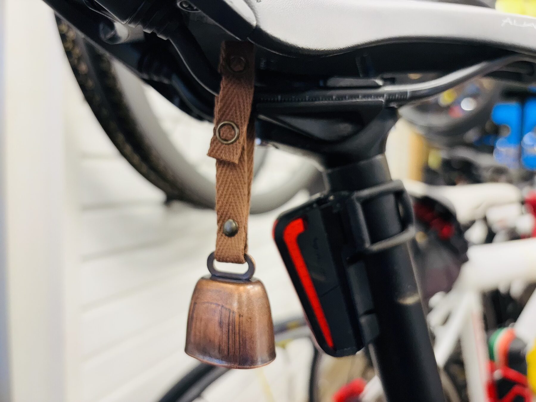 サドルの前方に付けたほうが音が鳴ります。但し下の写真のようにシートポストが傷つくので、シートポスト側の鈴が当たる箇所に保護テープを貼るなどの対策をすると良いと思います。特にカーボン製のシートポストを使用している方は気をつけましょう!