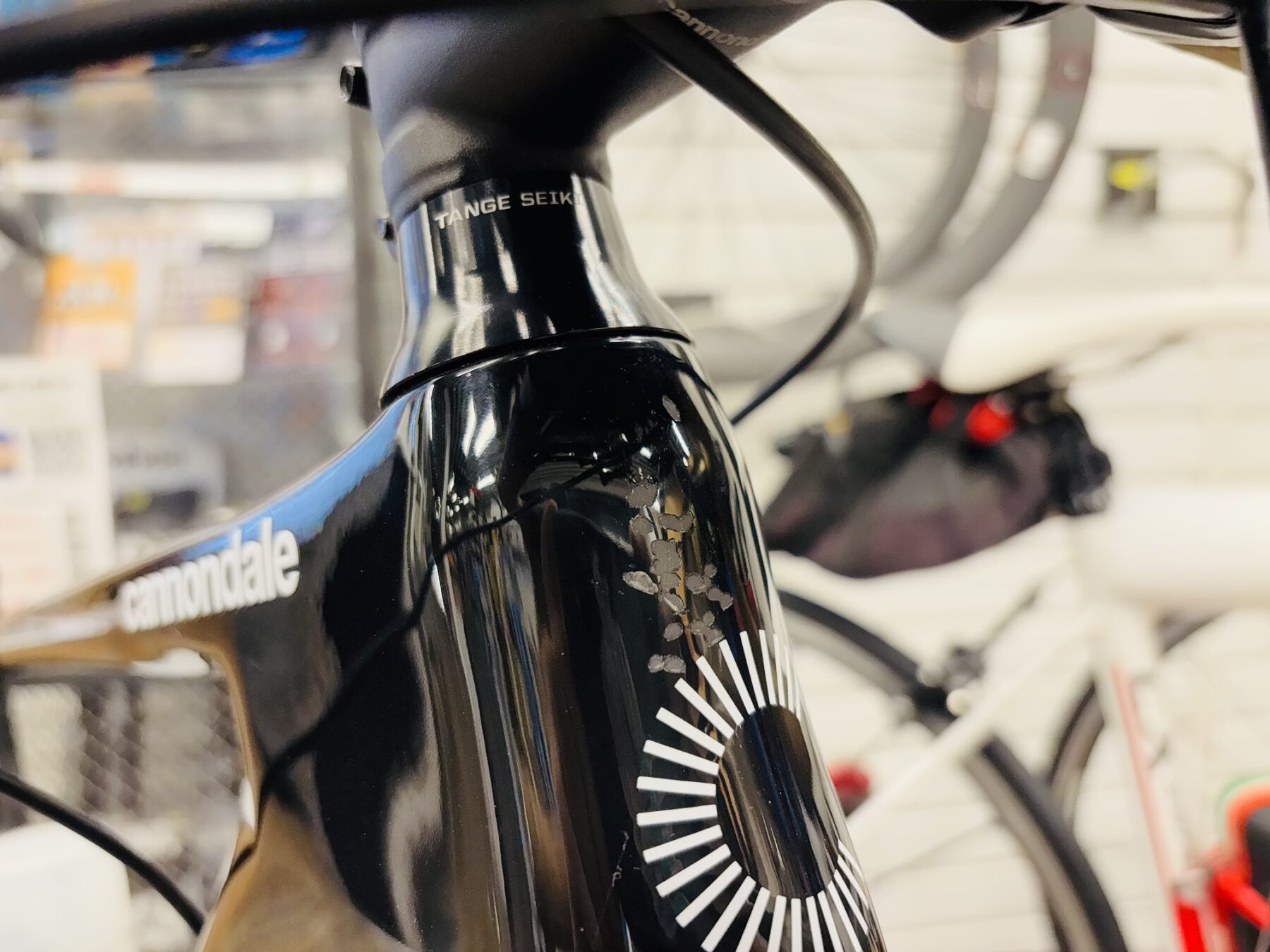 また、車体前部、ヘッドチューブ辺りに接触すると下写真のようにズタズタに塗装が剥がれます。これはかなりショックですね・・・上記同様、該当箇所に保護テープを貼るか、装着する場所を変えましょう。