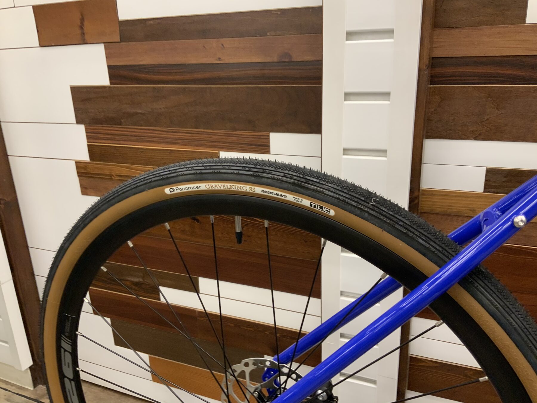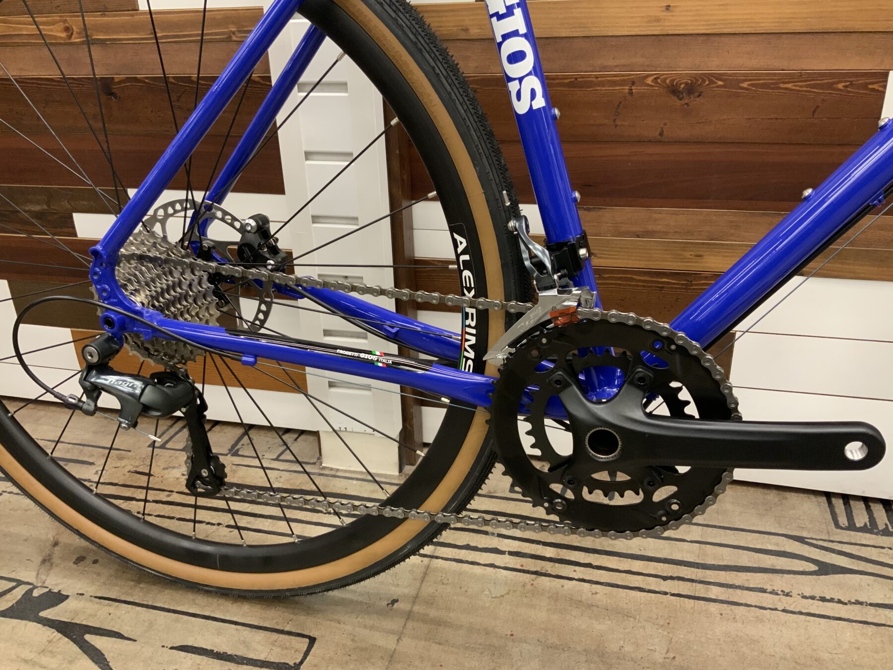 砂利道などの未舗装路を走るのにも安心な38cの太いタイヤを装着、コンポーネントはシマノのグラベルコンポーネント “ GRX“と“ティアグラ“ をMIXした仕様、フレームはスラっとした細身なチューブが特徴的なクロモリ素材を使ったジオスが得意とするスタイルですね。