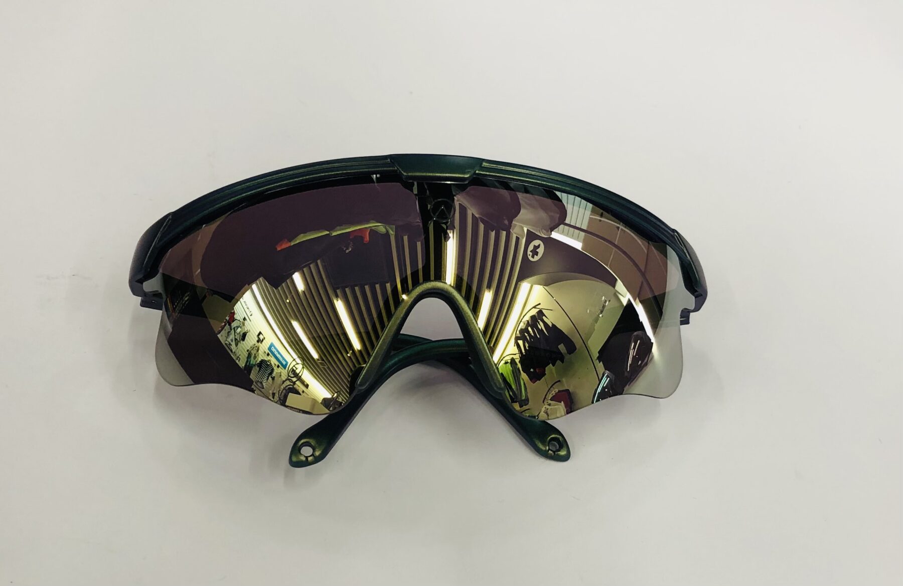 パープルからグリーンへ見る方向によってカラーが変わるメタリックなフレームとスポーティーなシェイプの効いたレンズは、頬との干渉を防ぎビッグレンズでありながら小顔効果も期待できます。