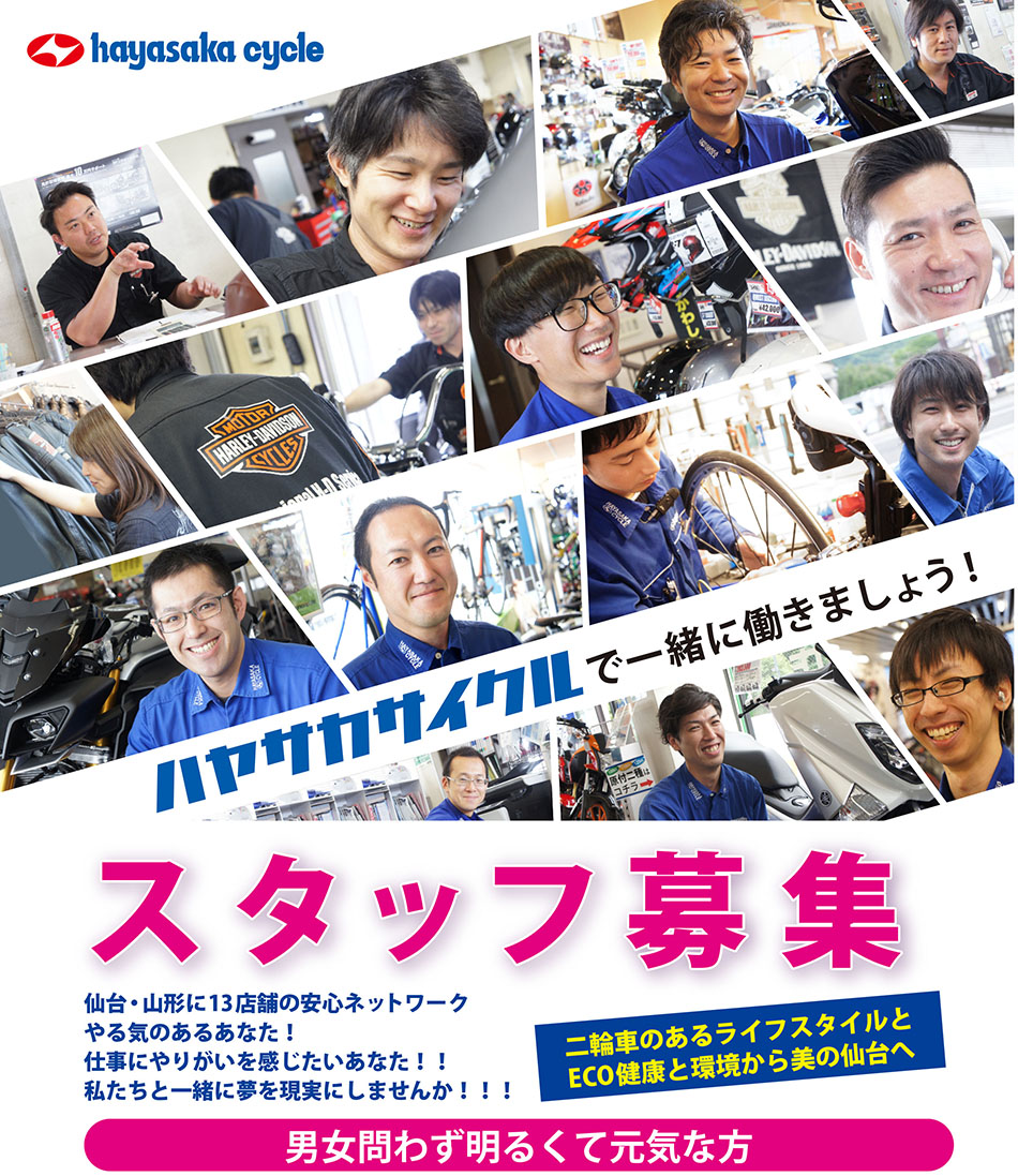 | 就業場所 | 仙台市内店舗(適性等により決定) ハヤサカサイクルグループ店舗一覧 宮城県仙台市青葉区上杉4-4-1 ハヤサカサイクル上杉本店 宮城県仙台市青葉区大手町9-1 ハヤサカサイクル大手町店 宮城県仙台市青葉区大手町8-18 モーターステージ大手町 宮城県仙台市青葉区八幡4-5-17 ハヤサカサイクル八幡町店 宮城県仙台市泉区松森字後田81-1 ハヤサカサイクル泉バイパス店 宮城県仙台市泉区松森字後田45-1 ハヤサカサイクルイオンタウン仙台八乙女店 宮城県仙台市泉区松森字浦田86 ハーレーダビッドソン宮城 宮城県仙台市泉区松森後田81-1 ハスクバーナ仙台 宮城県仙台市青葉区中央2-4-6 ハヤサカサイクル仙台中央店 宮城県仙台市若林区六丁の目元町1-3 カワサキプラザ仙台六丁の目 宮城県仙台市泉区松森字後田85-1 カワサキプラザ仙台泉 宮城県仙台市若林区六丁の目元町1-1 ホンダドリーム仙台六丁の目 宮城県仙台市太白区郡山字籠ノ瀬40番 YSP仙台 山形県山形市浜崎6 ハヤサカサイクル山形店 山形県山形市浜崎6 チェリーズハーレーダビッドソン山形 |