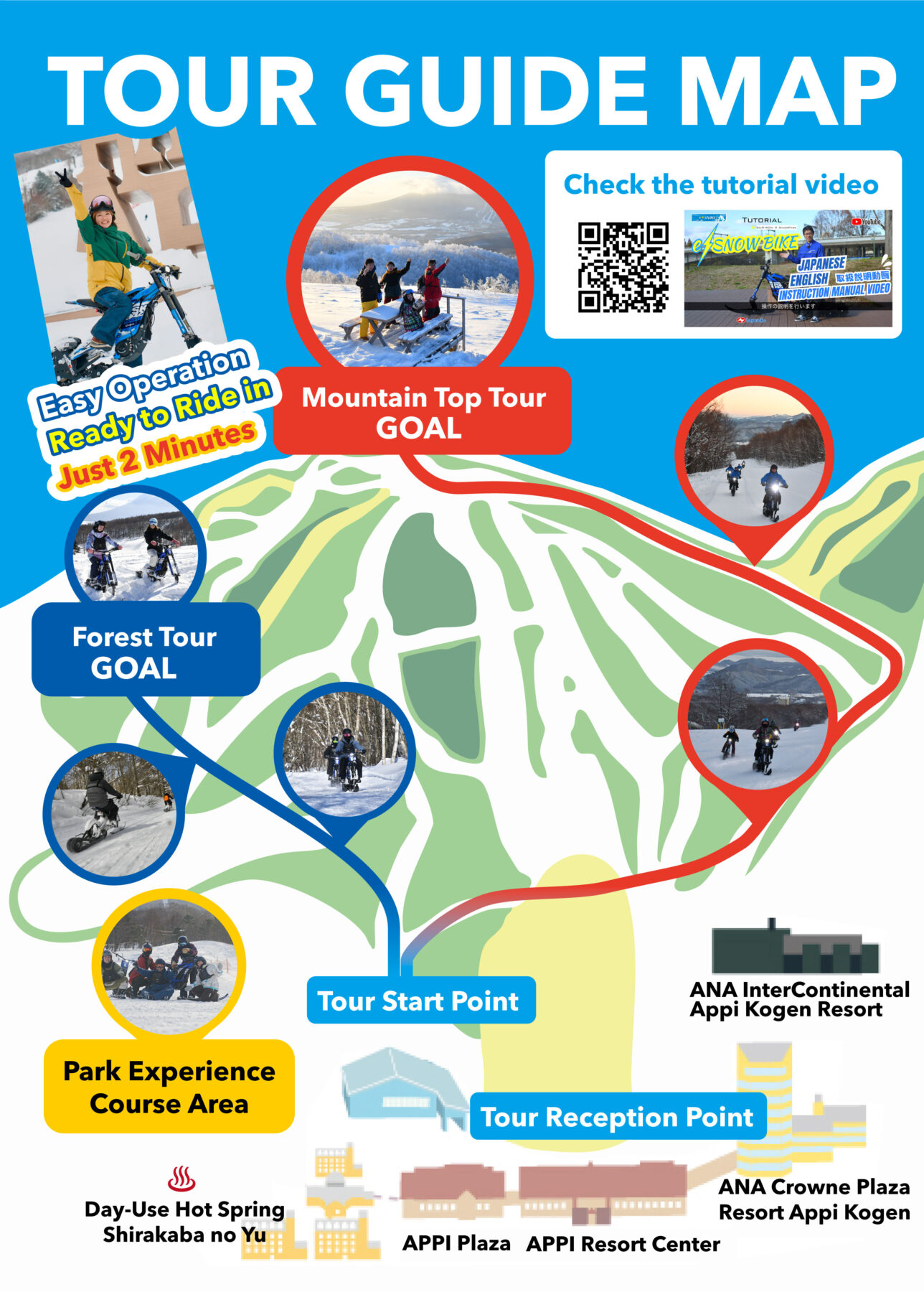 Since you will be riding in a specially prepared park area, you can experience the fun of e-SNOW BIKE safely and securely.