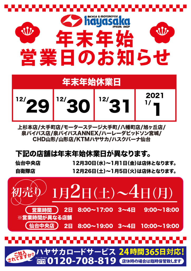 | 2021年1月2日(土) | 仙台中央店 8:00~19:00 仙台中央店除く店舗 8:00~17:00 |