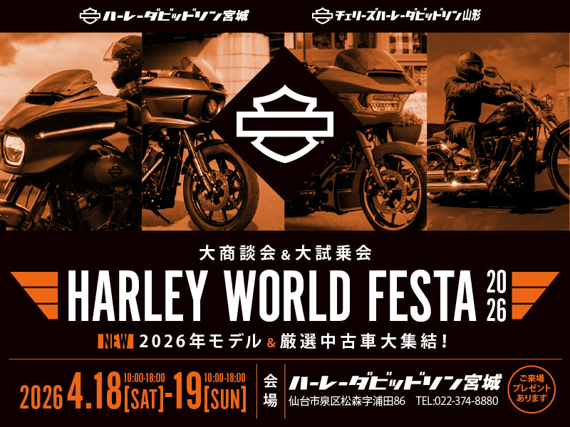 宮城・山形唯一のハーレーダビッドソン正規ディーラー、Harley-Davidson宮城、Cherry’sHarley-Davidson山形では 話題のNEWモデルから人気沸騰のラインナップをご用意!さらに登録済み未走行車、優良中古車など、宮城・山形から大集合!H-Dが誇る造形美をご確認ください。