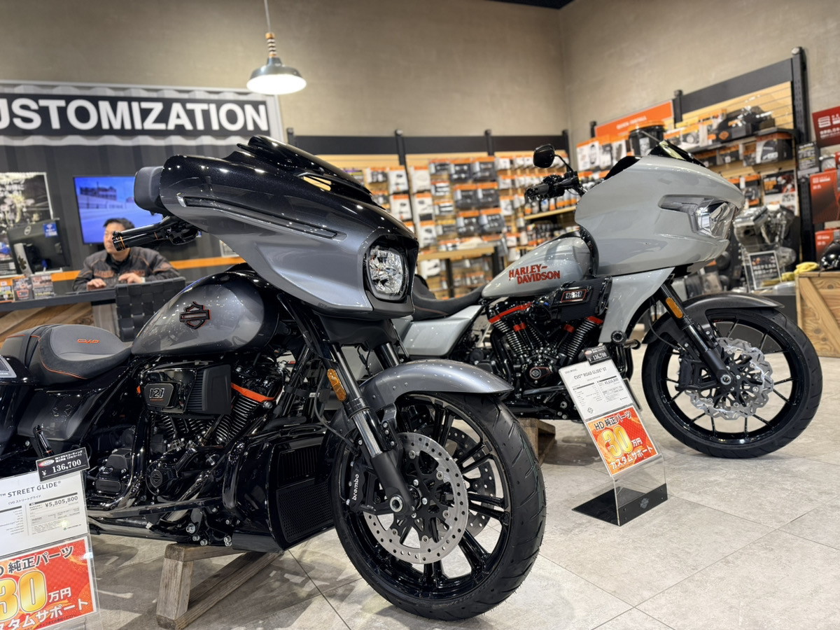 また、2024イヤーモデルおよび、2025イヤーモデルも、最大60万円分のカスタムサポートを実施中!人気のブレイクアウトやローライダーST、台数限定モデルのCVOシリーズなどもショールームに取り揃えております。