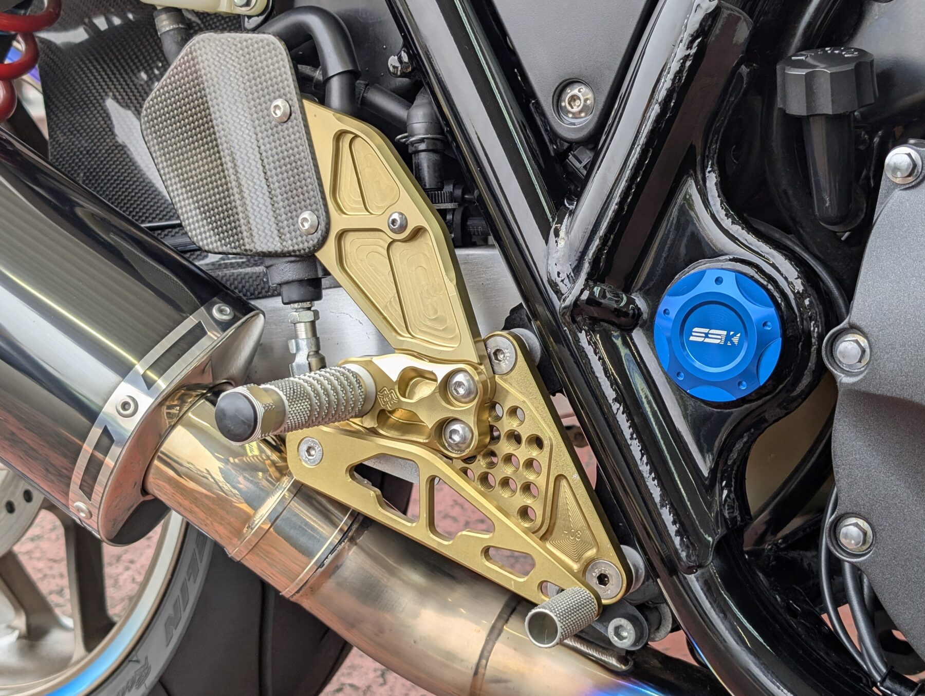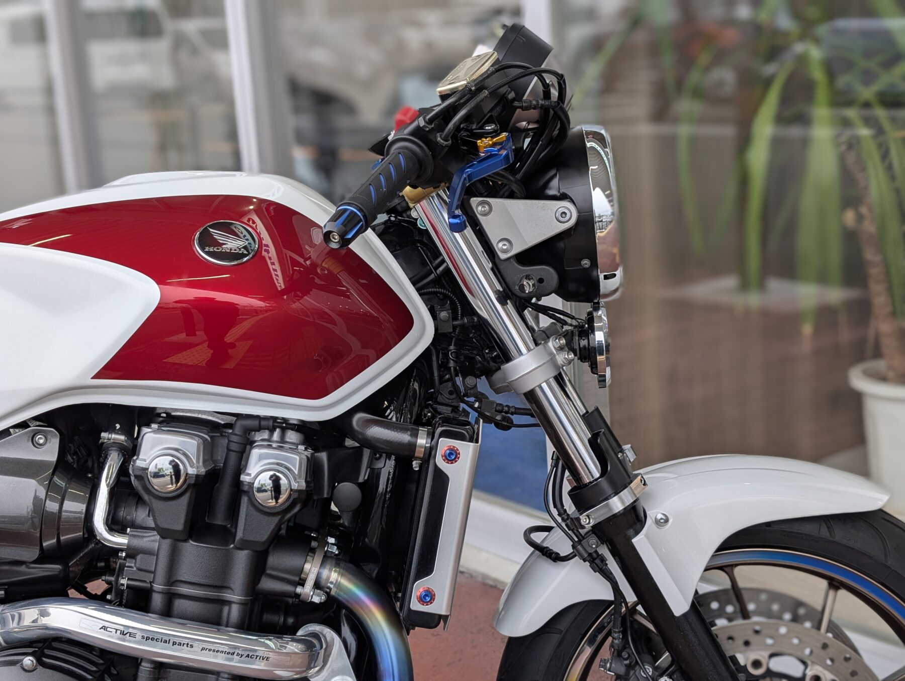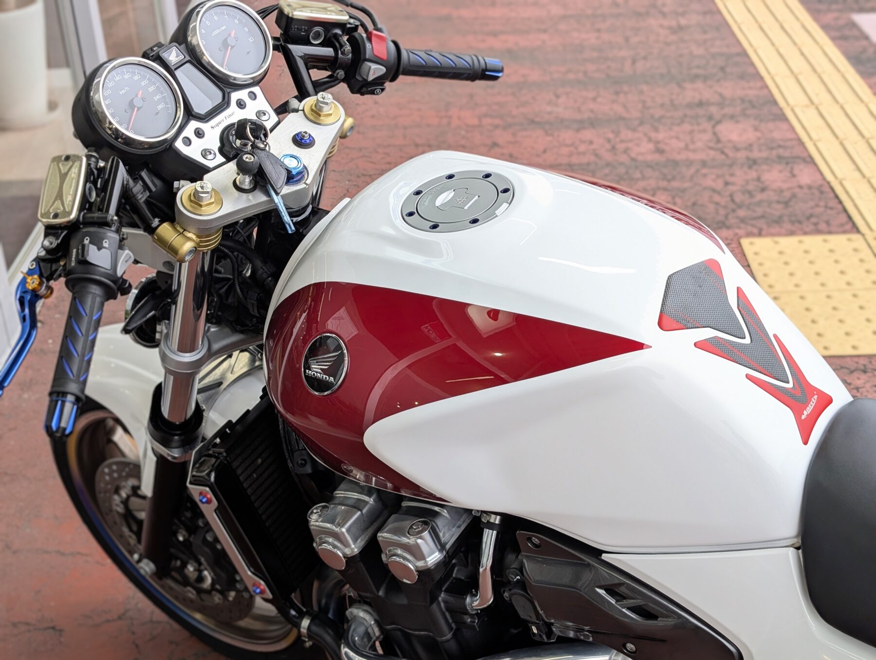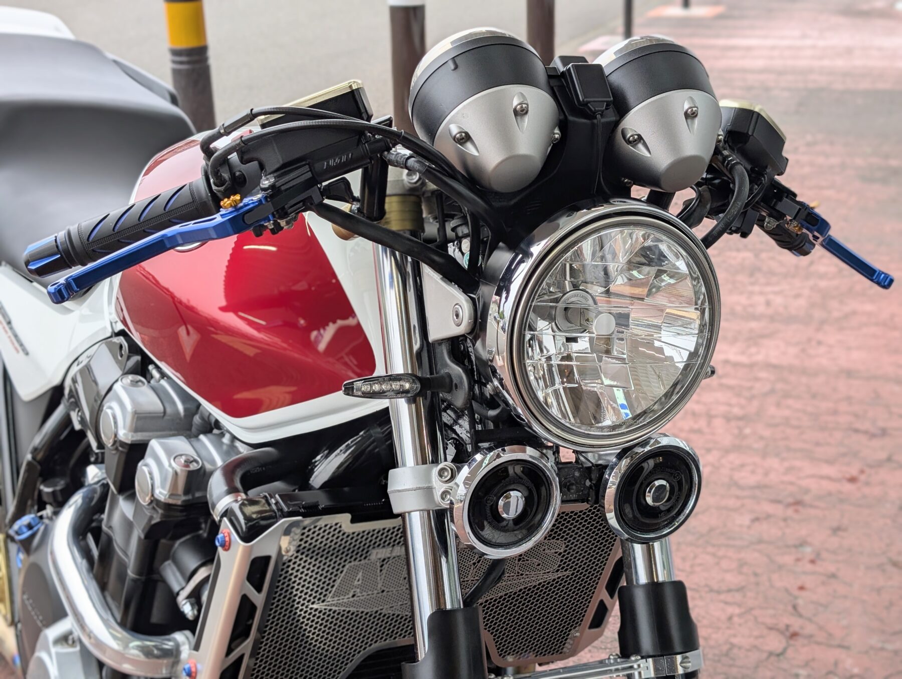 見た目の印象と乗り味を大きく変えるセパレートハンドルとバックステップ、ライディングポジションをやや前傾にすることでスポーティーなポジションと乗り味に変貌。とは言え、あくまでベースはCB1300SFですので一般的なスーパースポーツの様に極端な前傾ではなく、やや前傾程度。ハンドル切れ角も純正と変わらずハンドルロックもそのまま使えます。