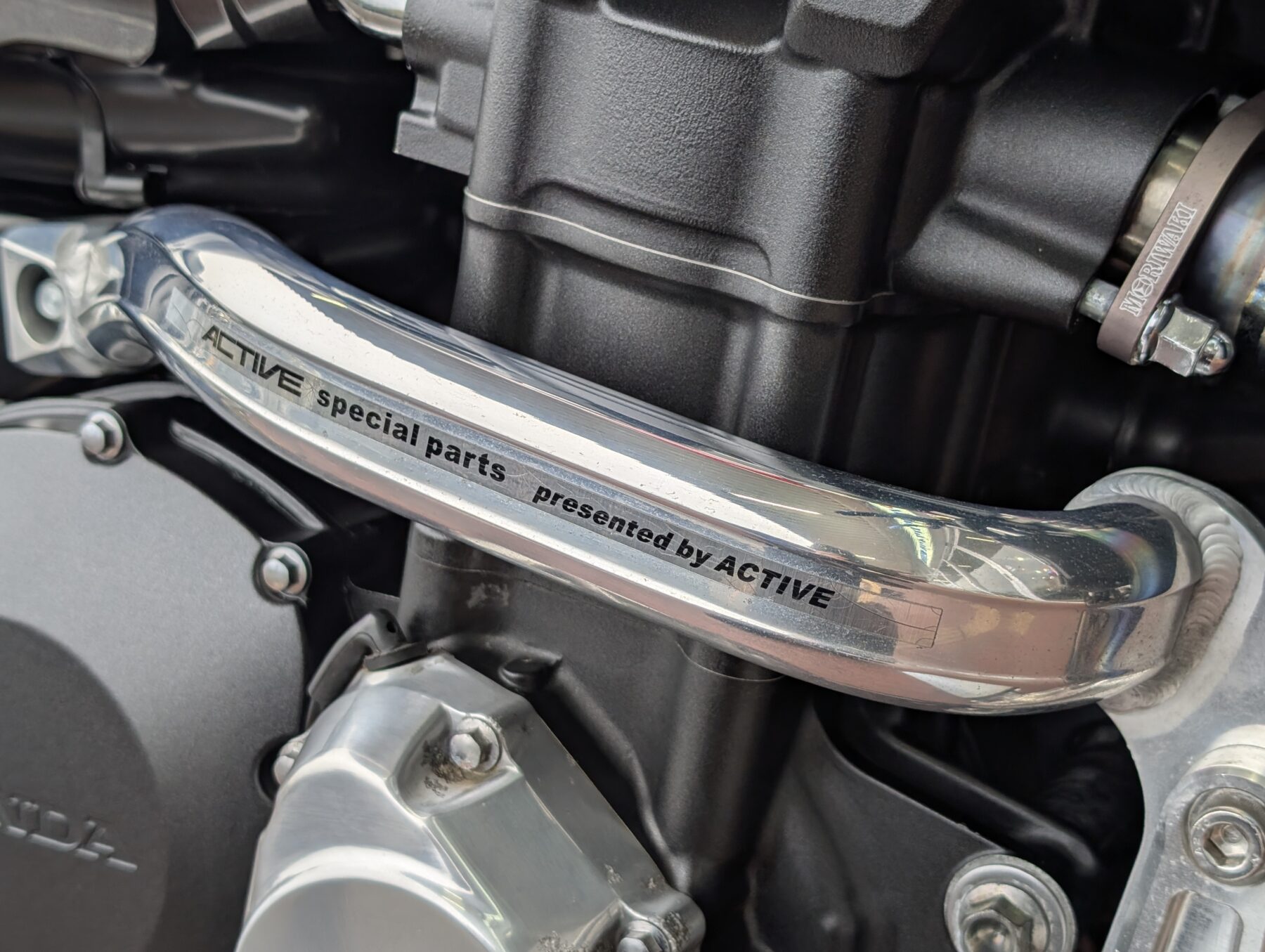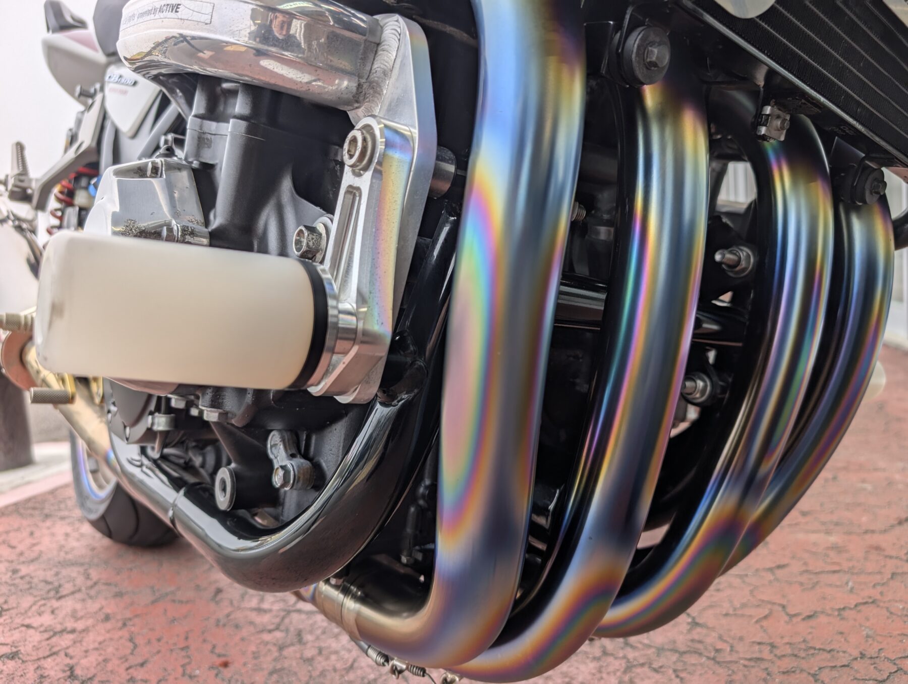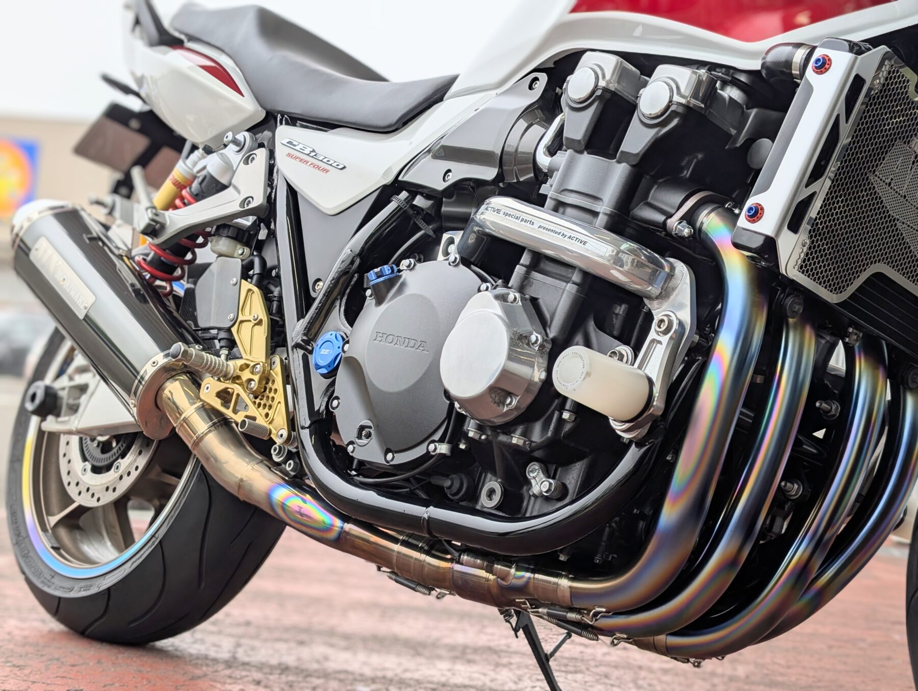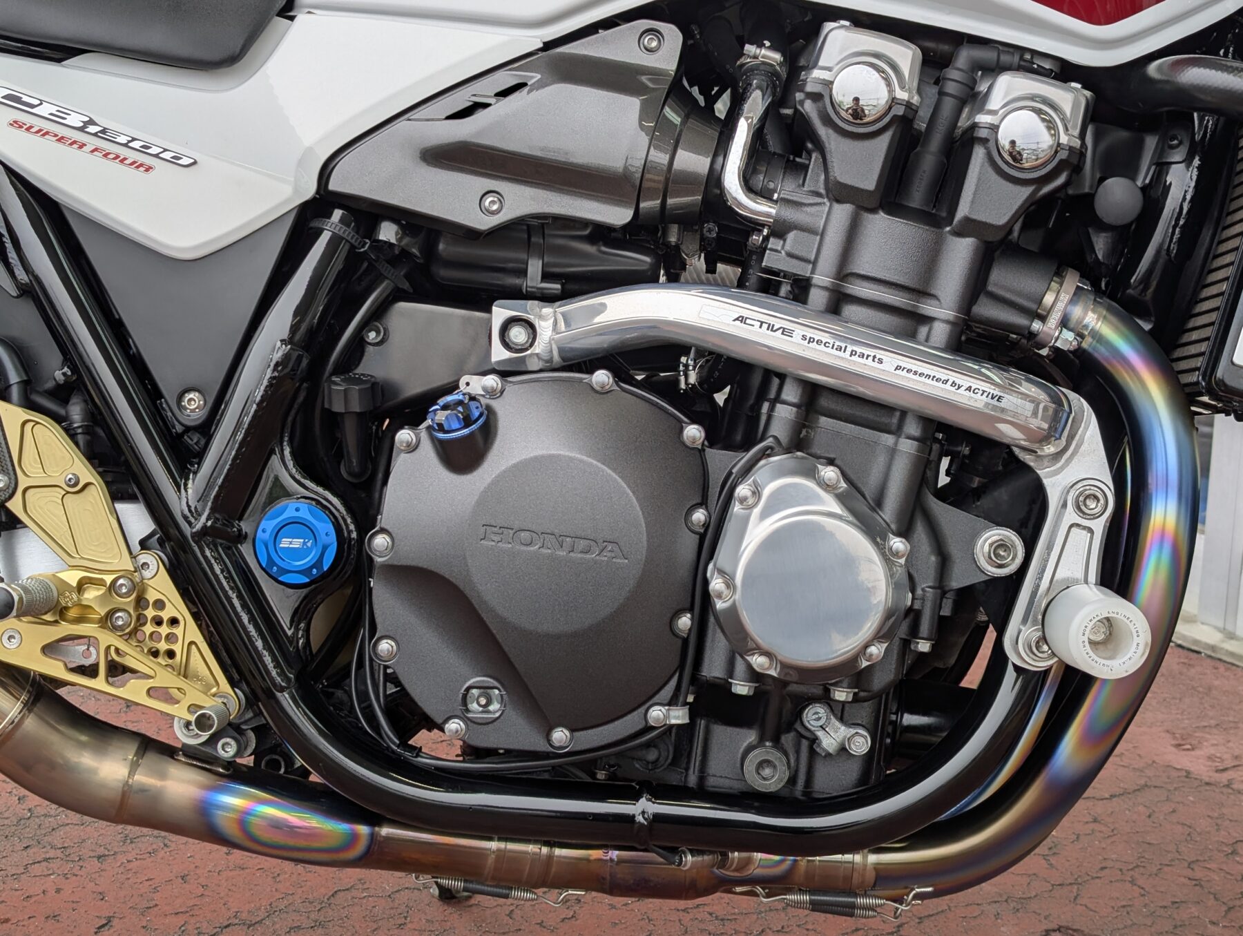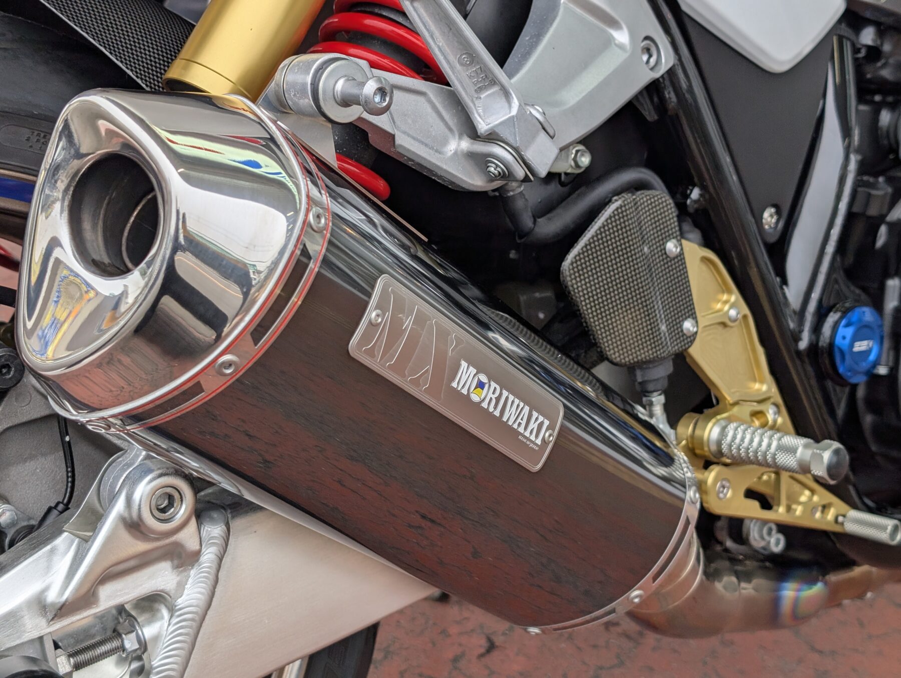 排気をモリワキのチタン製フルEX(車検対応)へ交換。素材から組付精度/溶接まで美しいこのマフラーは純正と比べても大幅な軽量化に貢献し、車検適応ながら本来のポテンシャルを引き出す排気効率で全域パワーアップ。チタン合金の放熱の早さによる熱対策等、本来の機能面向上も望めますが、単純にチタン特有の質感と焼け色が美しい。エキゾーストパイプ4本が生み出す贅沢な輝きが存在感抜群で憧れる方も多いはず。勿論、排気音も格好良いです!