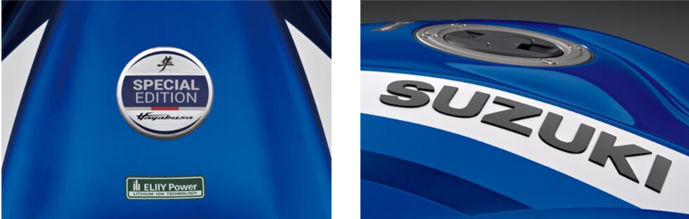 鮮やかなブルーを基調としたボディに、純白の「隼」ロゴが際立つスペシャルエディション。各部に配した白いアクセントや専用ビジュアルが、より洗練されたスタイリングを創出します。フューエルタンクには立体的な質感を持つ「SUZUKI」ロゴと、スペシャルエディション専用エンブレムをレイアウト。さらに、マフラーエンド&カバーを精悍なブラックで仕上げることで、特別仕様ならではの存在感と上質さを強調しています。