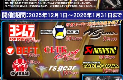 皆様、バイクのマフラー交換にどんなイメージをお持ちでしょうか? 「音が大きくなるだけ」「見た目が格好良くなるだけ」そんなイメージを持たれている方も少なくないはず。特に近年のモデルは良く出来ているので「交換しても大して変わ … 続きを読む 【WINTER SALE】社歴20年の社員がマフラーを熱く語る会。愛車の性能を開放せよ!カスタムマフラー交換キャンペーン開始!