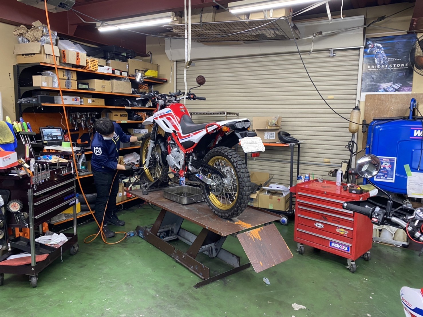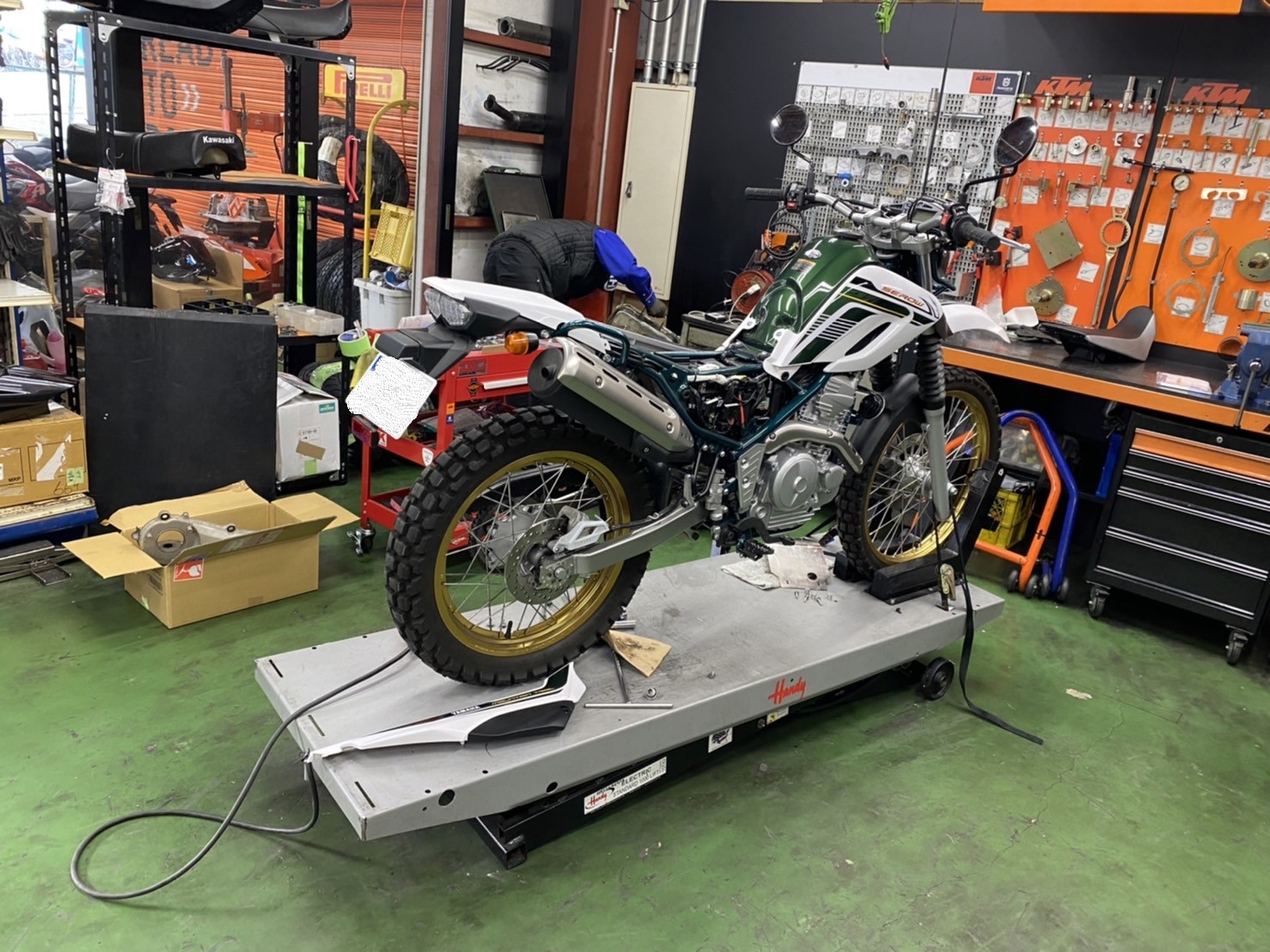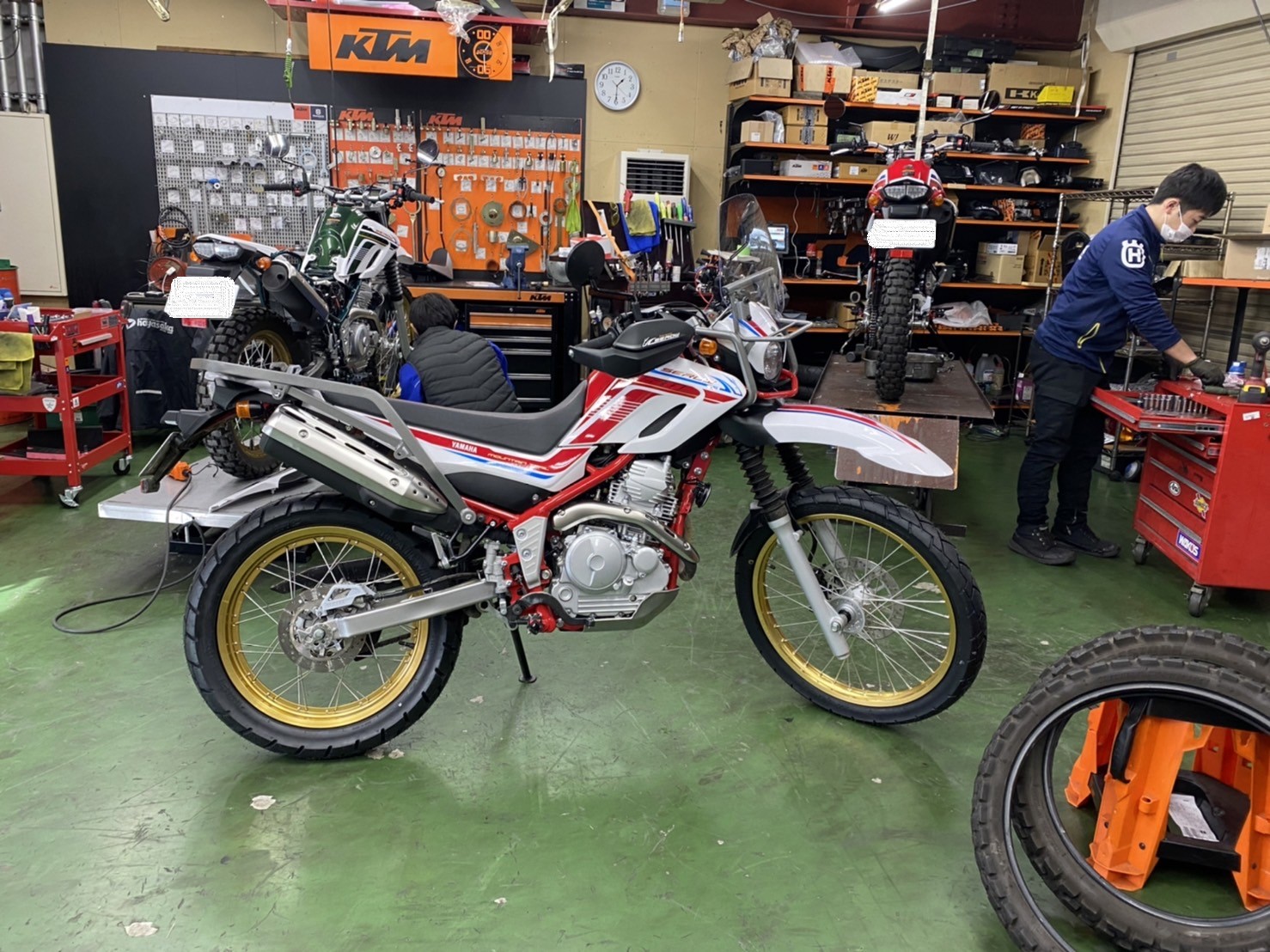 手前のツーリングセローはオフからオンへのタイヤ交換、後ろの2台は冬に向けてのメンテナンス中です