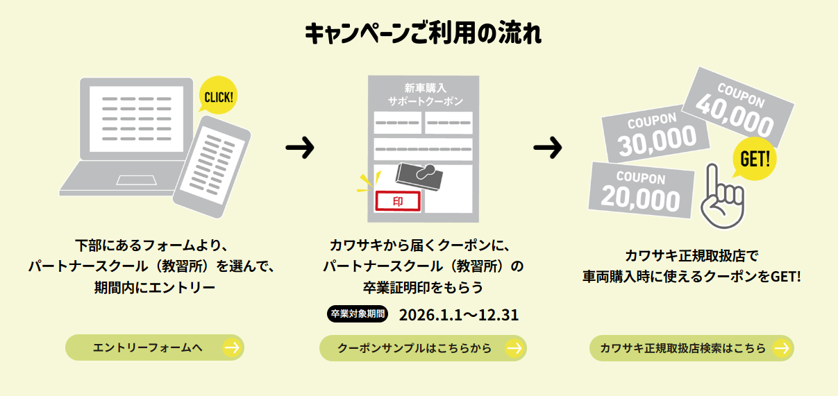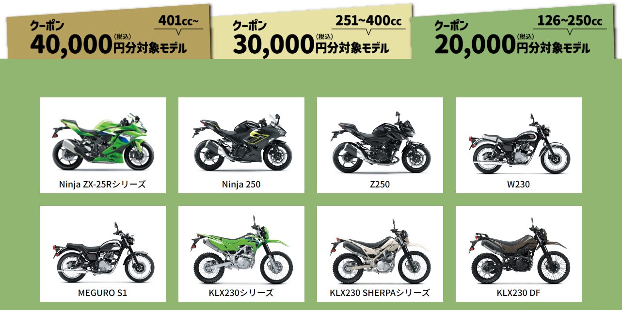 ・対象モデルの新車を車両購入期間中にカワサキ正規取扱店で購入する。