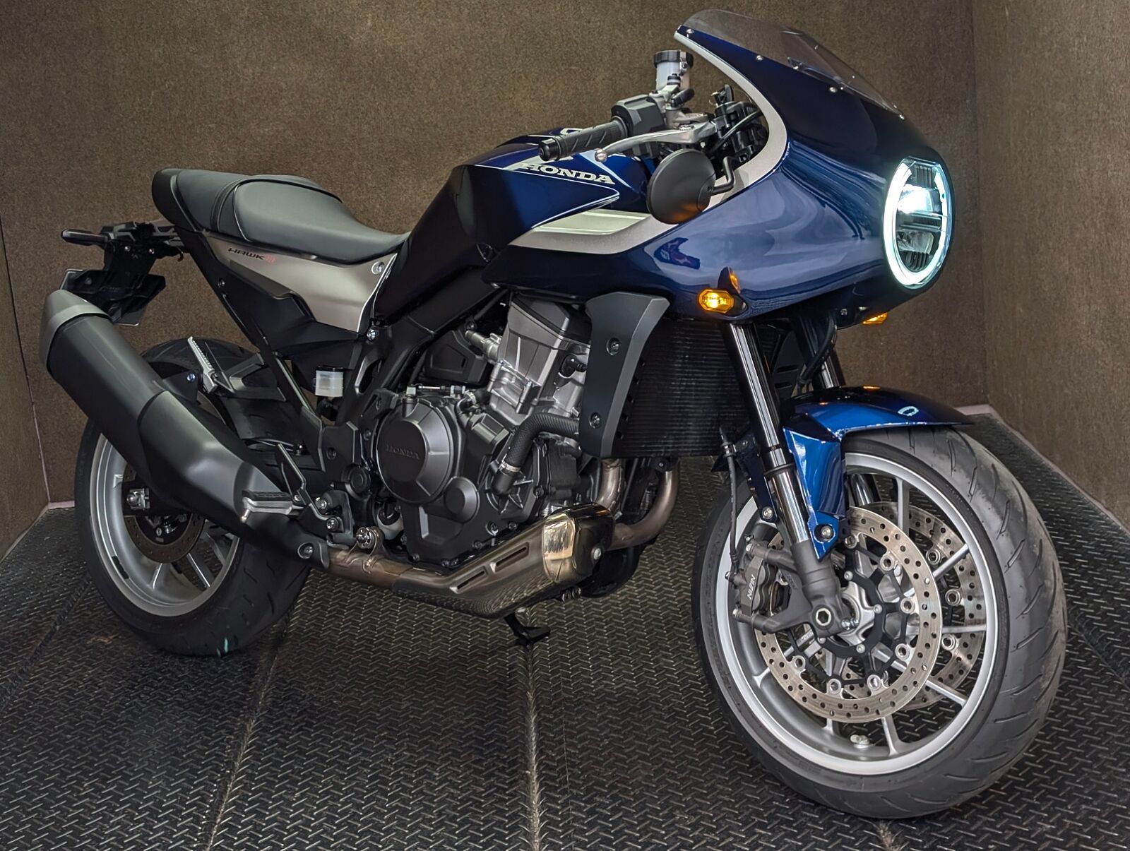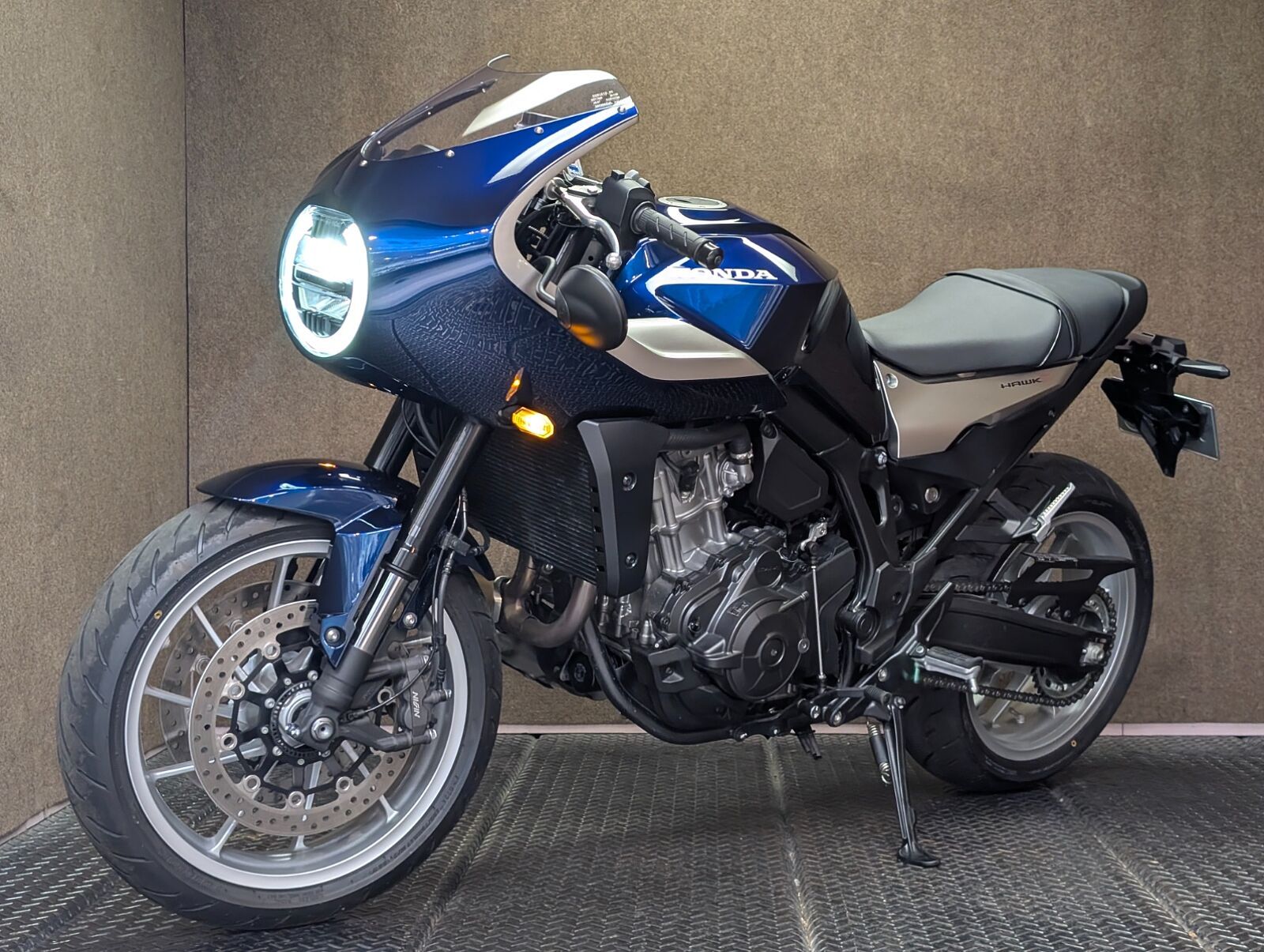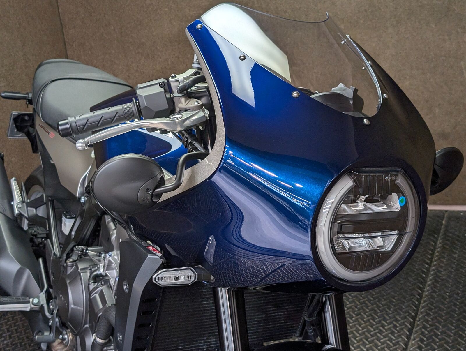 アッパーカウル(ロケットカウル)は樹脂ではなくFRP(繊維強化プラスチック)で成形した贅沢な仕上がり。ネオレトロ調のフォルムが美しく、エンジンは1,082cc並列2気筒。セパレートハンドルながらもポジションは見た目ほど前傾過ぎない姿勢が維持できるので街乗りからワインディングまでスポーティーに走りが堪能できます✋ また低回転域からのトルクフルな力強さ、心地よい鼓動感の演出とエキゾーストノート、電子制御が前に出過ぎないどこかクラシカルな名残を思わせる走りもHAWK11の魅力です✌️