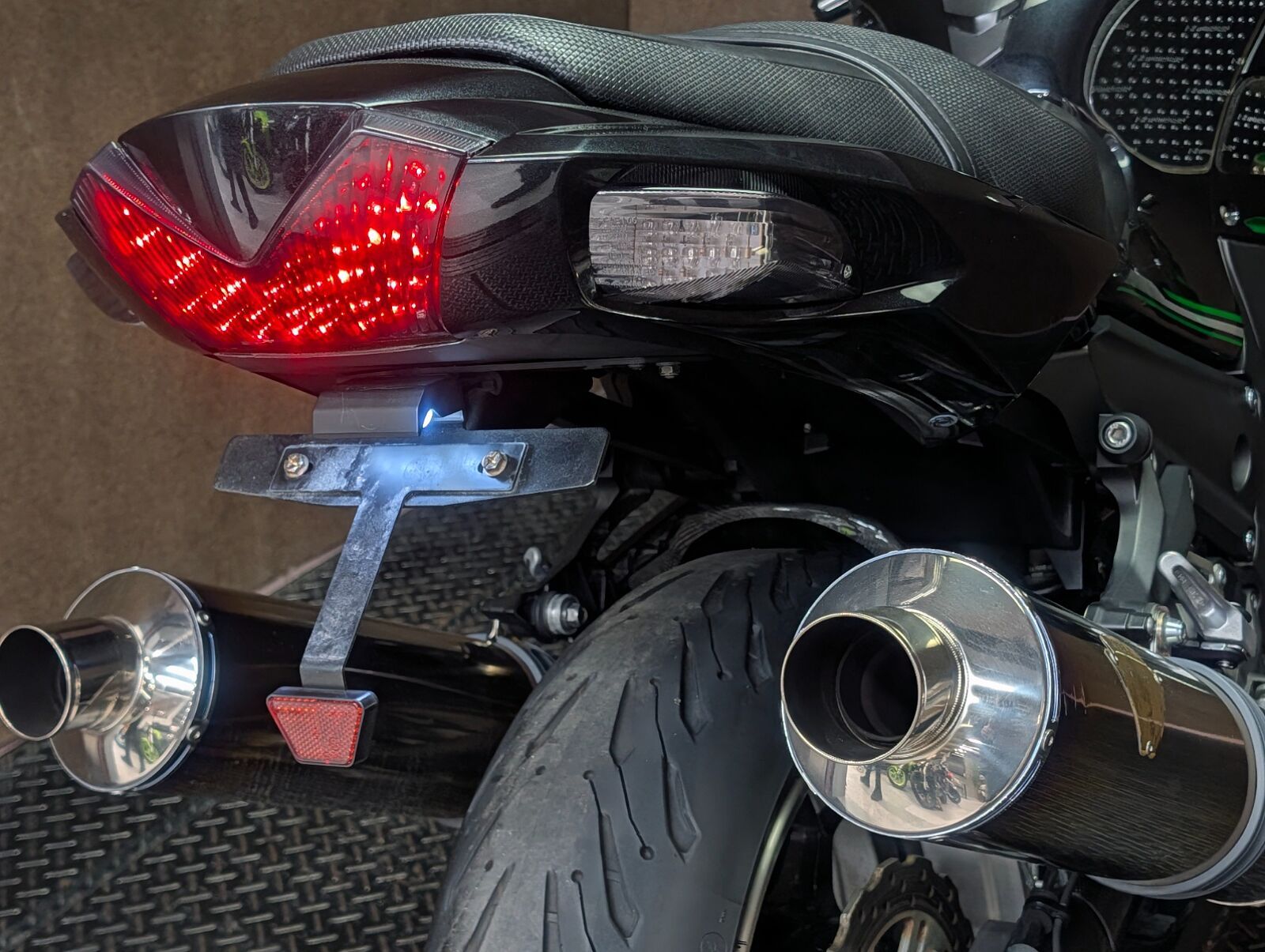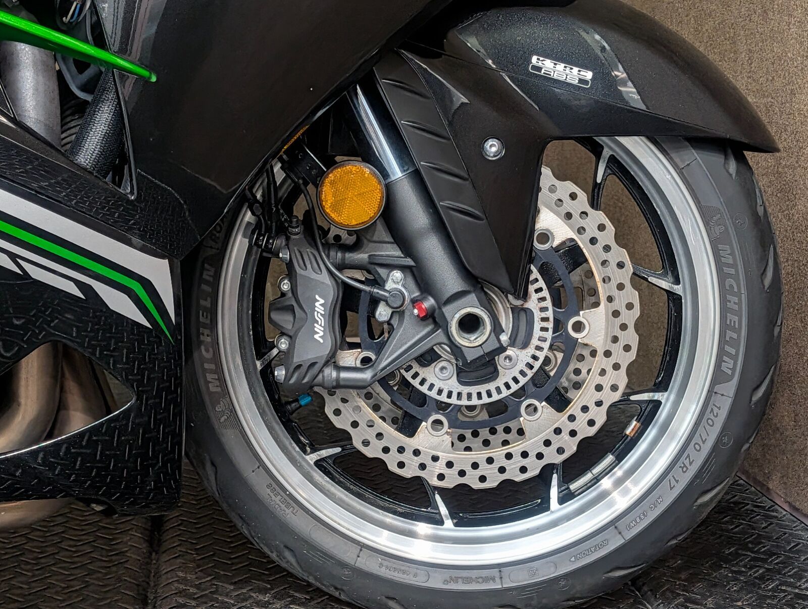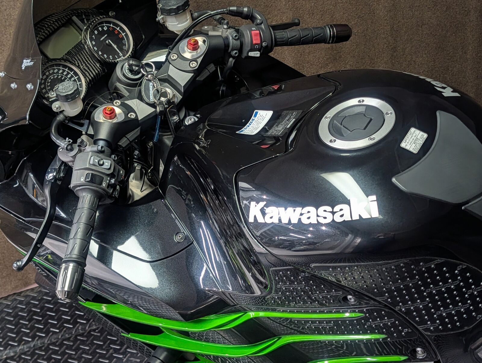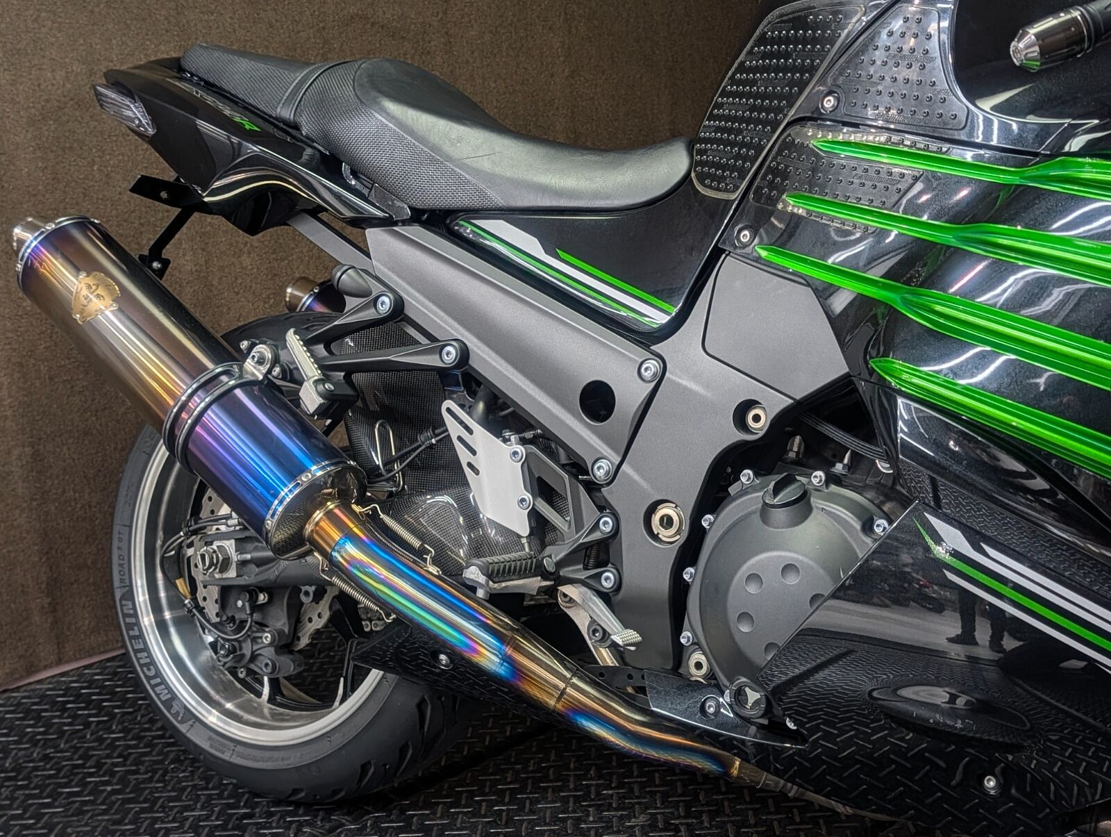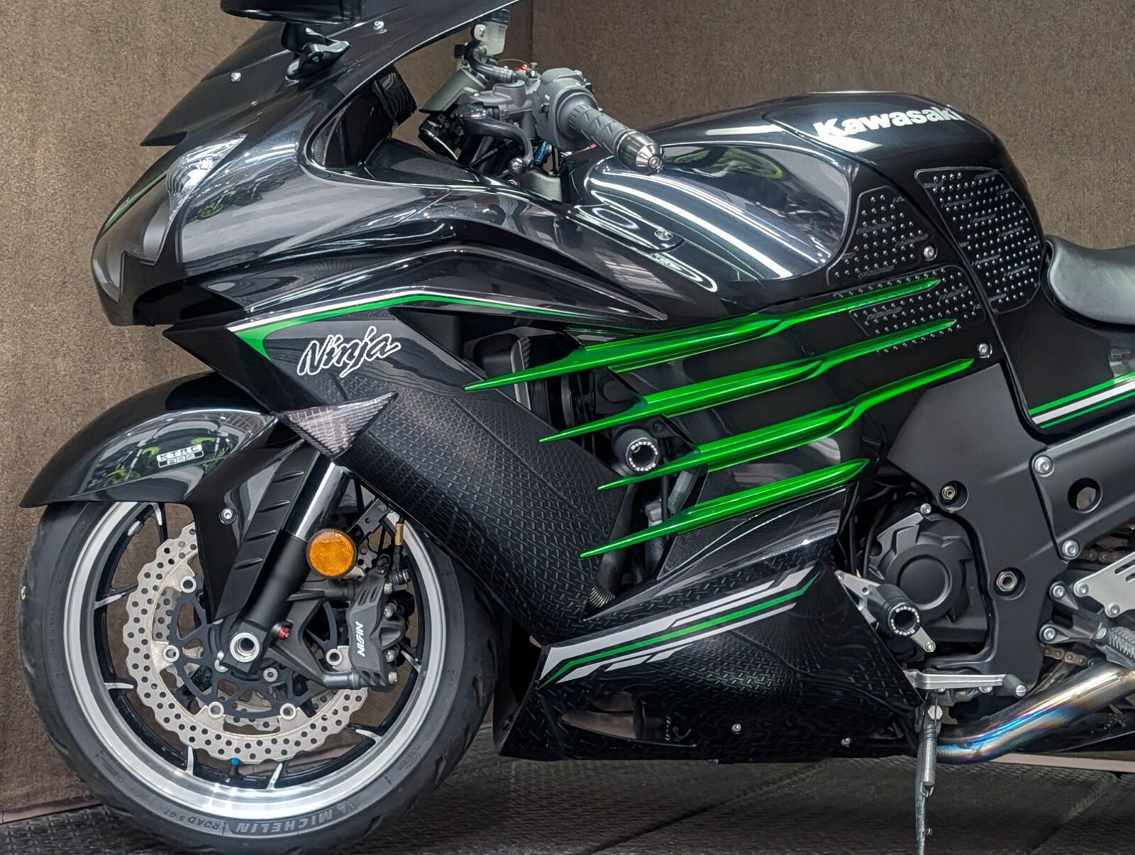 ZX-14時代の1,352ccから1,441ccに拡大した水冷直列4気筒エンジンを搭載。地面を踏み締め,発進と共に風景が後ろへ流れ出すような圧倒的なトルク感,加速時には太い咆哮のような排気音を放つ桁違いの存在感!! 音を聞き、力を感じた瞬間、このバイクの内に秘めたるパワーに惹きつけられ,乗り手は高揚感に包まれることでしょう。並行輸入車につき国内向け仕様のセンタースタンドは付きませんが、よりスポーティーなアンダーフェアリングが装着済みです。<スリップオンマフラーは純正戻しでの納車となります>