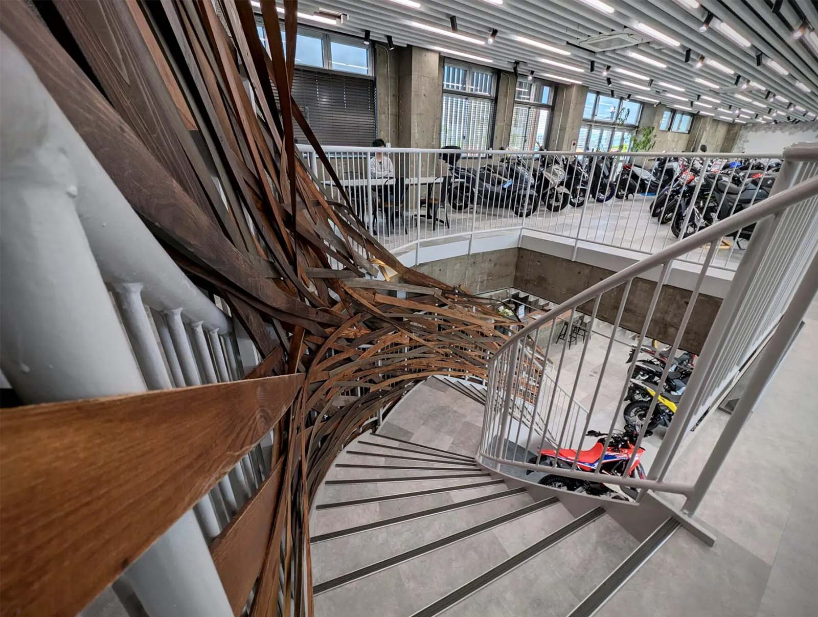 日が落ちてからも、外は暗く中は明るい状態となり、こだわりのライティングからじっくりとバイクを堪能いただくことができます。