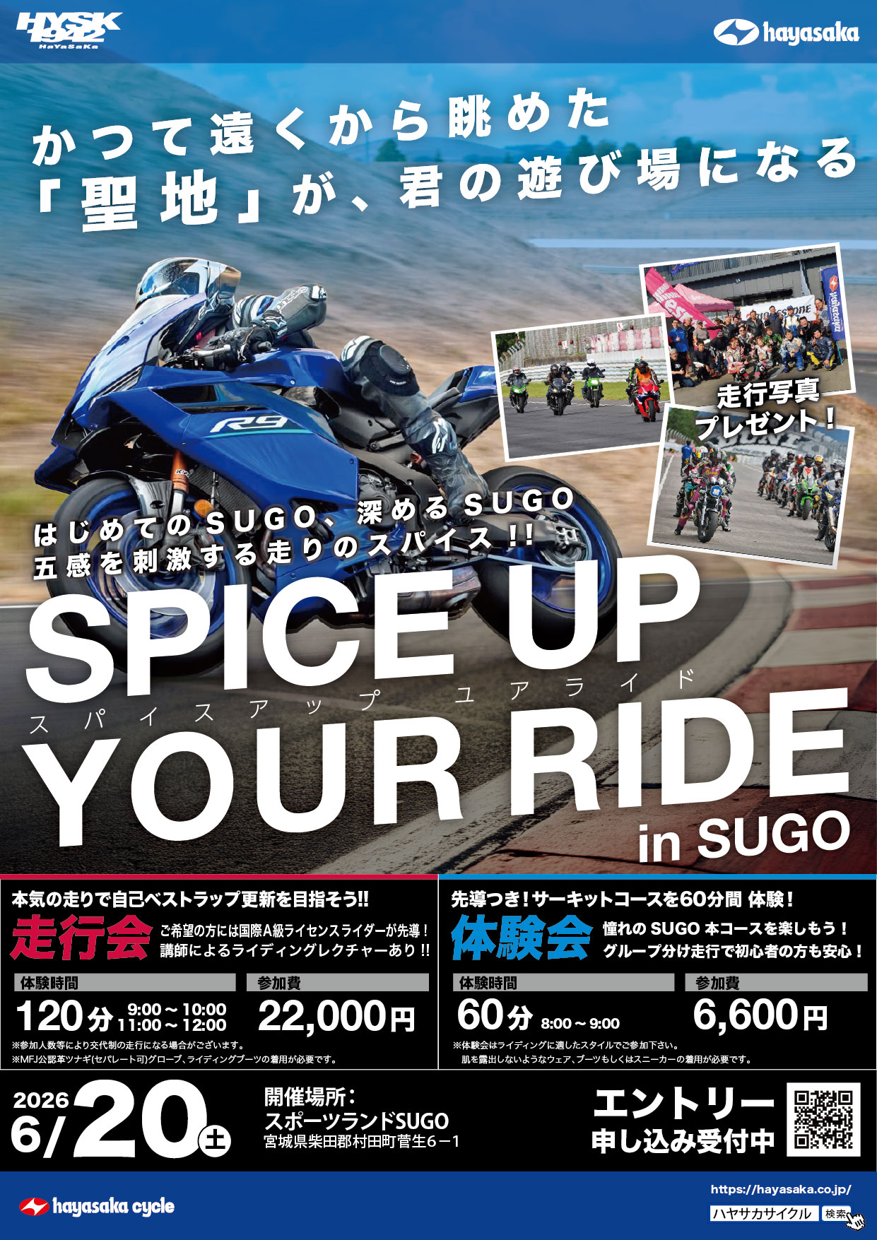 6/20(土)開催のSPICE UP YOUR RIDE サーキットを思いっきり走る走行会は6/17(水) 13:00までのエントリー(※最終入金は6/18まで)です。 バイクをフルに愉しむイベントです。初心者でも楽しめるバイクイベントですので、申し込みをお待ちしております。下記エントリーフォームからご応募ください
