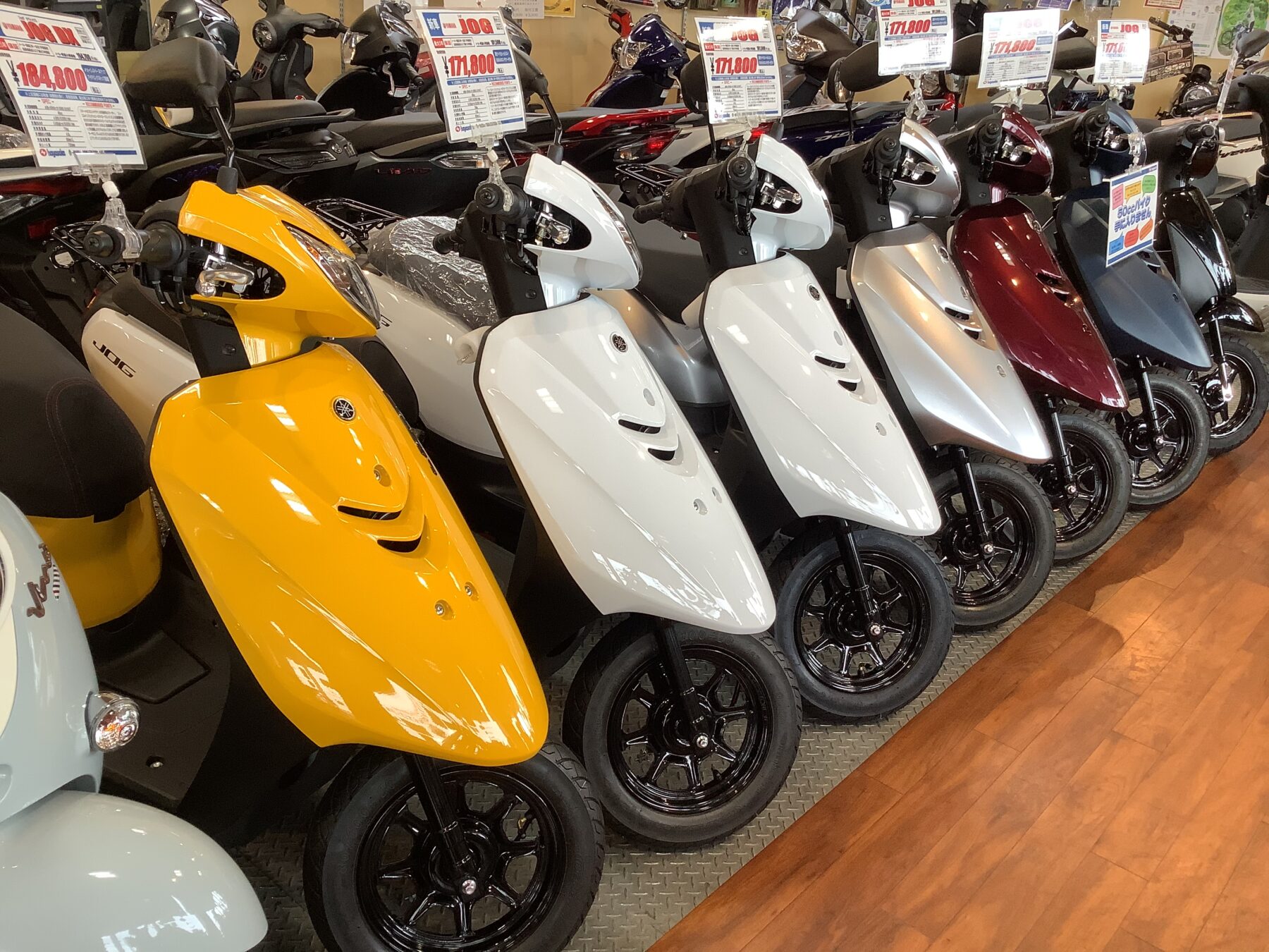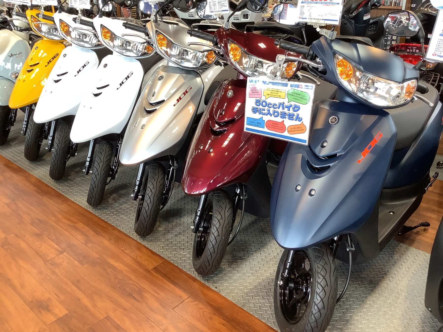 新車の50ccが生産終了になるのは皆様ご存じかと思いますが、当店では多数新車の【JOG】を展示中です!