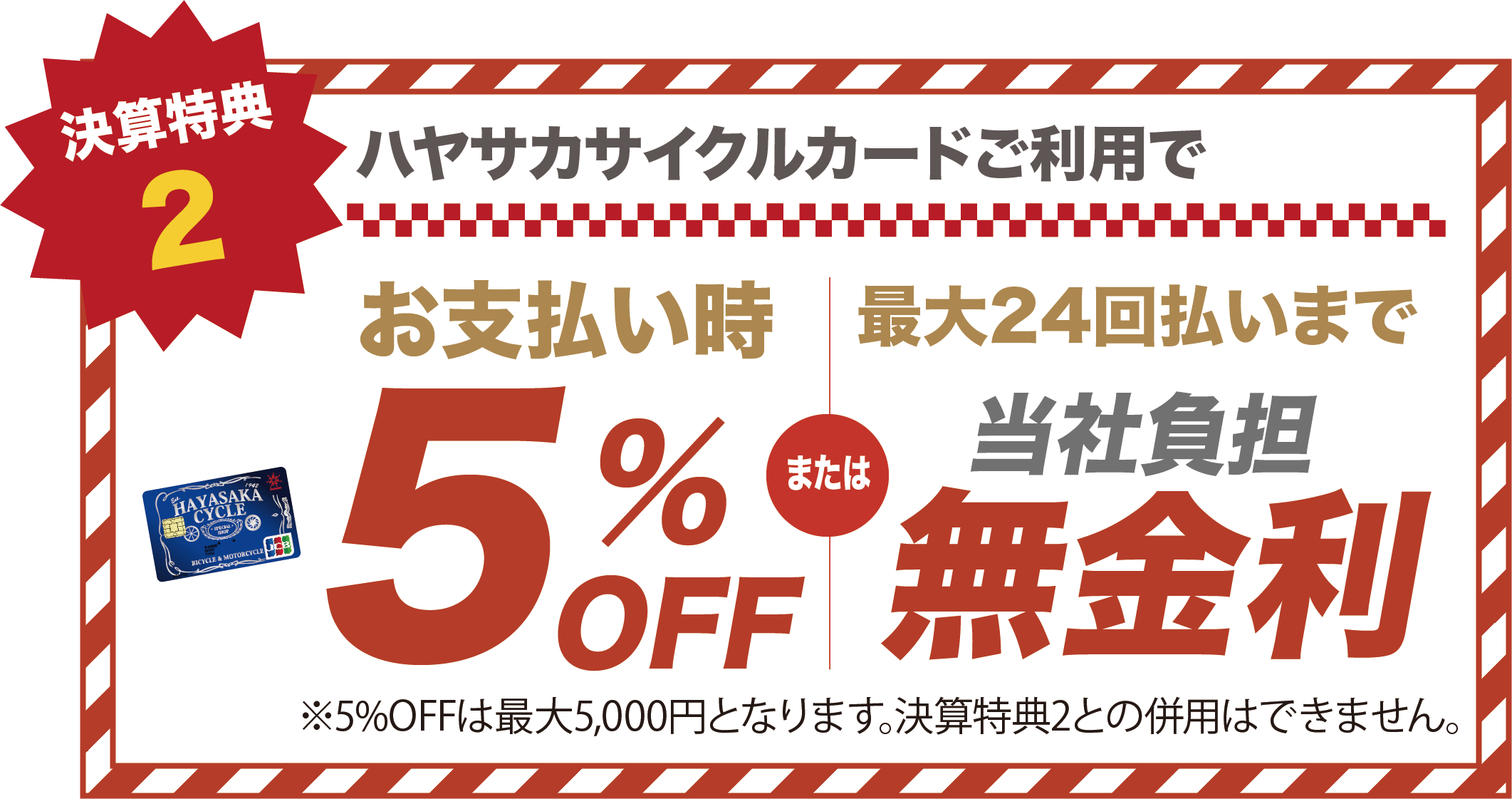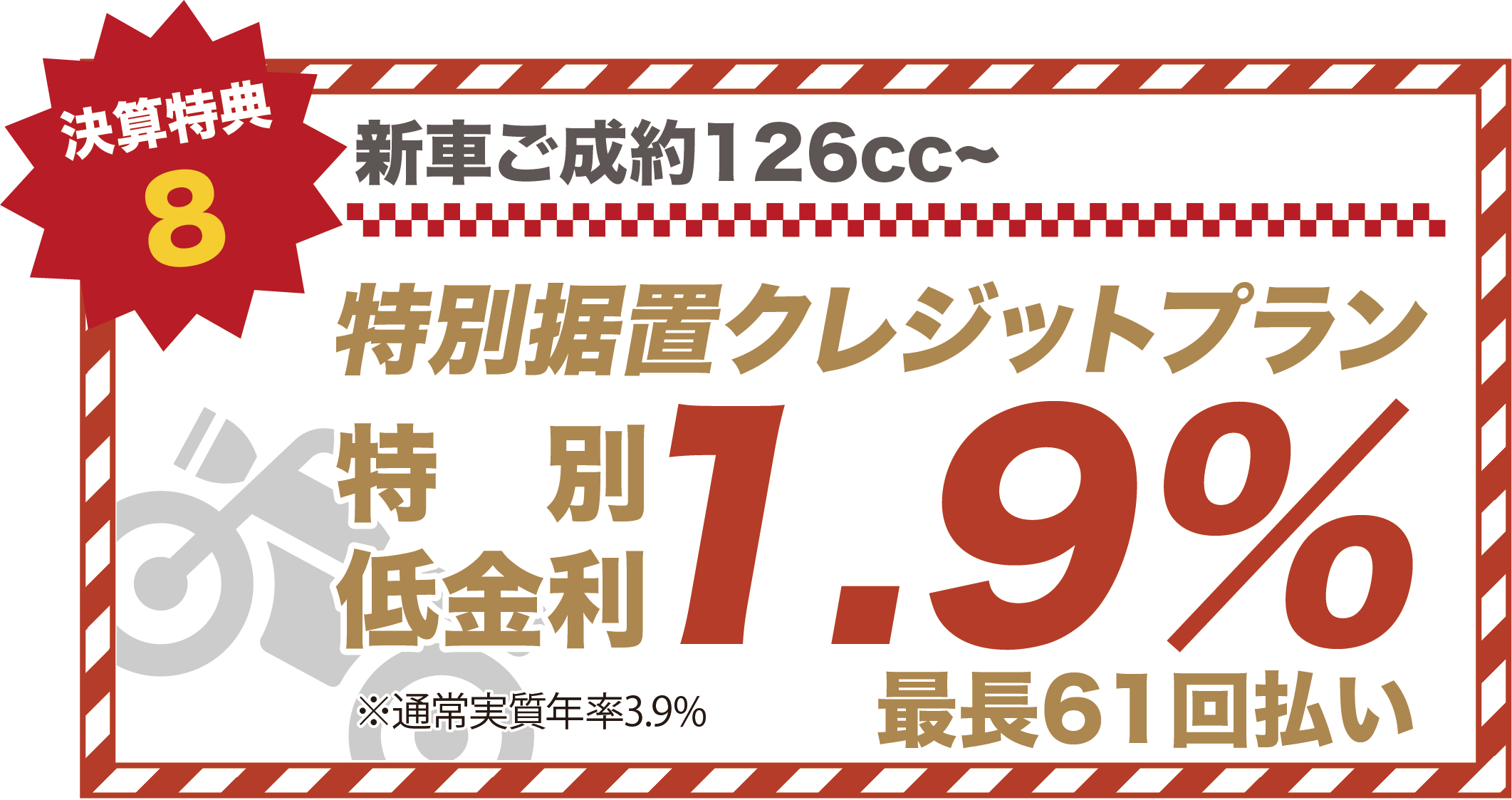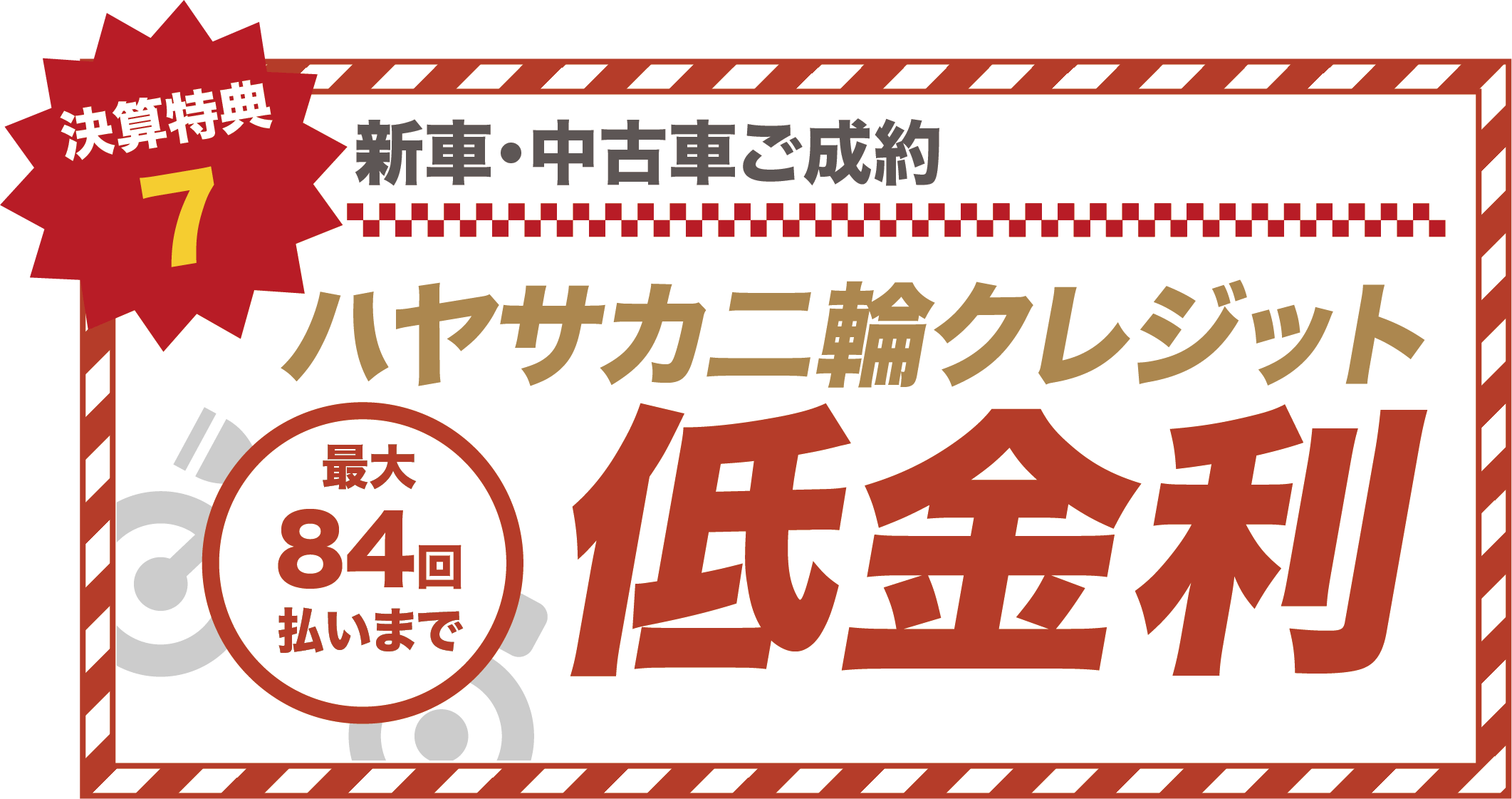 バイクの表示価格は現金特価となります。お得な分割払いもご用意しておりますので、お気軽にご相談ください。