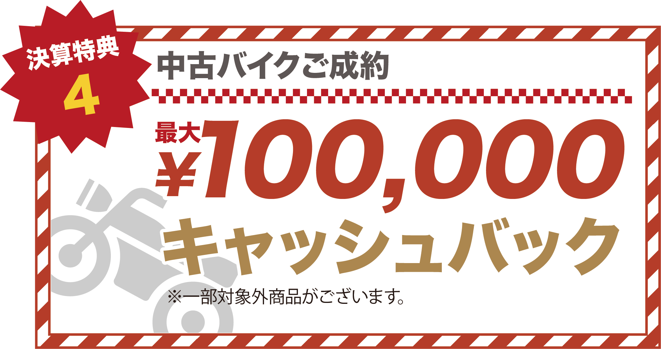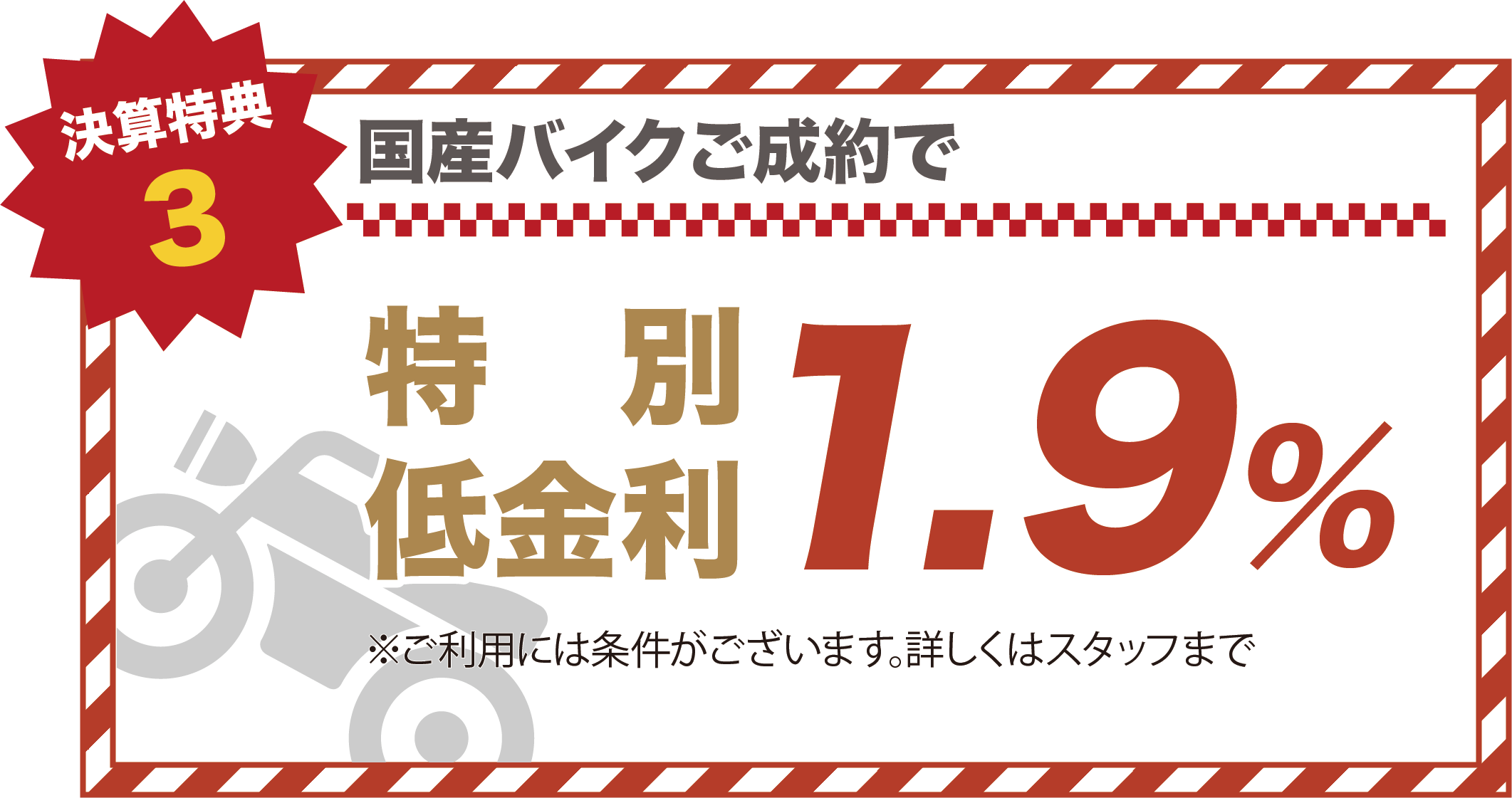 バイクの表示価格は現金特価となります。お得な分割払いもご用意しておりますので、お気軽にご相談ください。