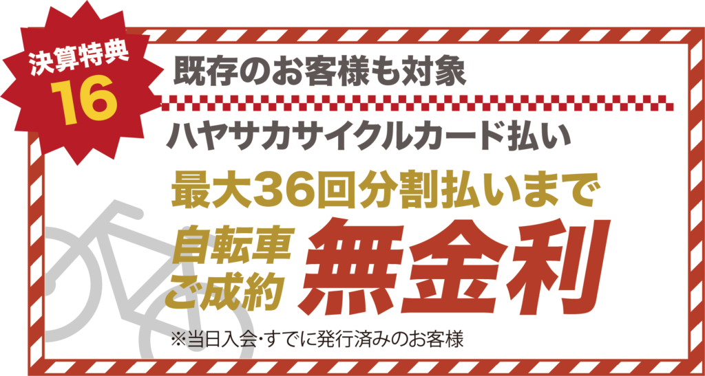 ハヤサカサイクルは、新価格保証で「常により安く」をご提供。また気になる購入後もお得な各種サービスメニューがございます。