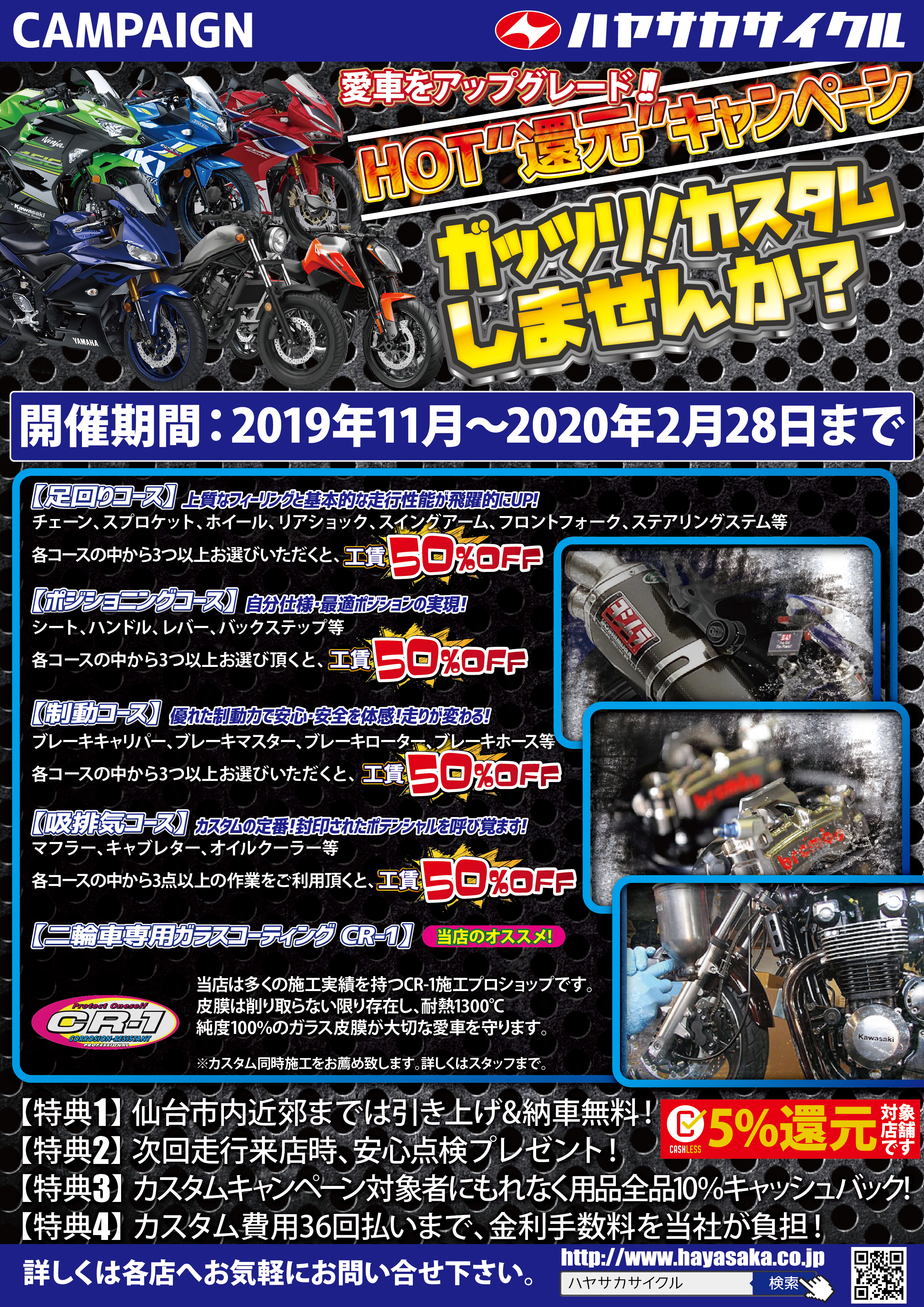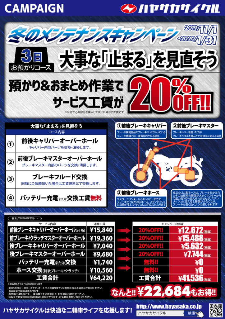 冬期はこれまで乗ったバイクをじっくりとメンテナンスに最適な季節!期間中お預かり&おまとめ作業でメンテナンス工賃を割引!